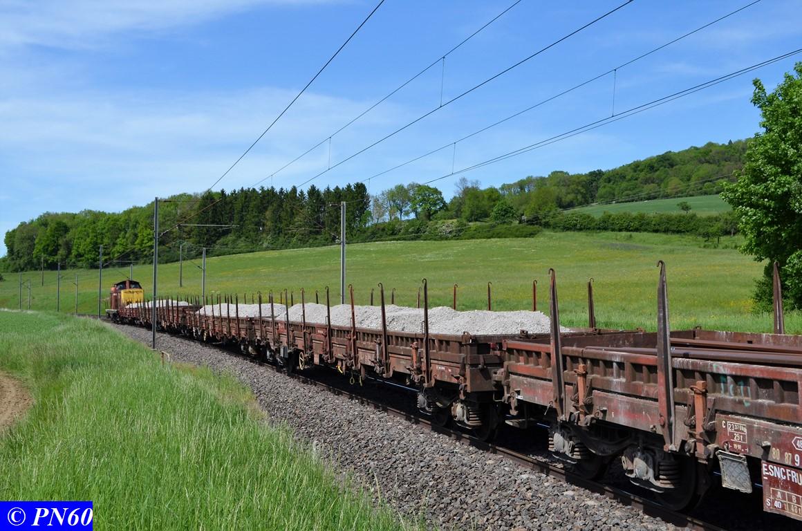 Le 23 mai 2017, un nouveau train de travaux poussé par la V212 GENIFER n° 87 9 182 586-7 regagne sa zone de chantier, suite...