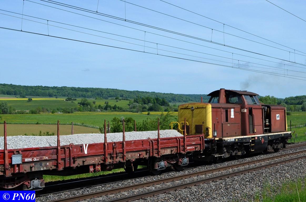 Le 23 mai 2017, un nouveau train de travaux poussé par la V212 GENIFER n° 87 9 182 586-7 regagne sa zone de chantier, suite...