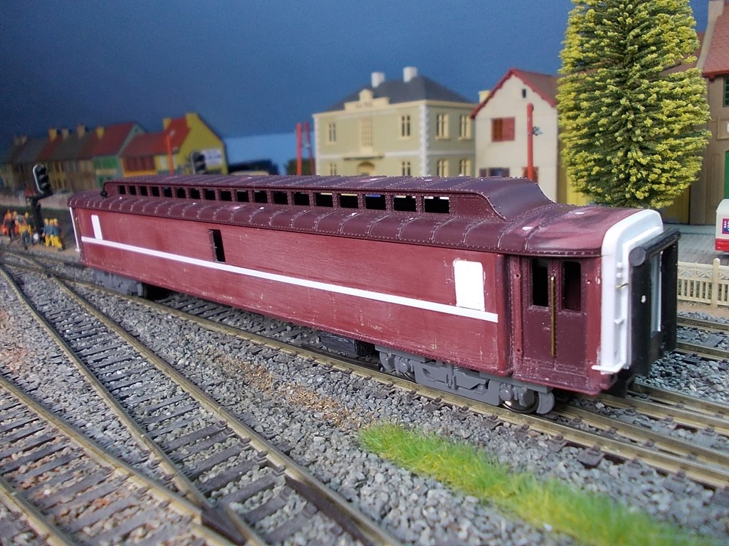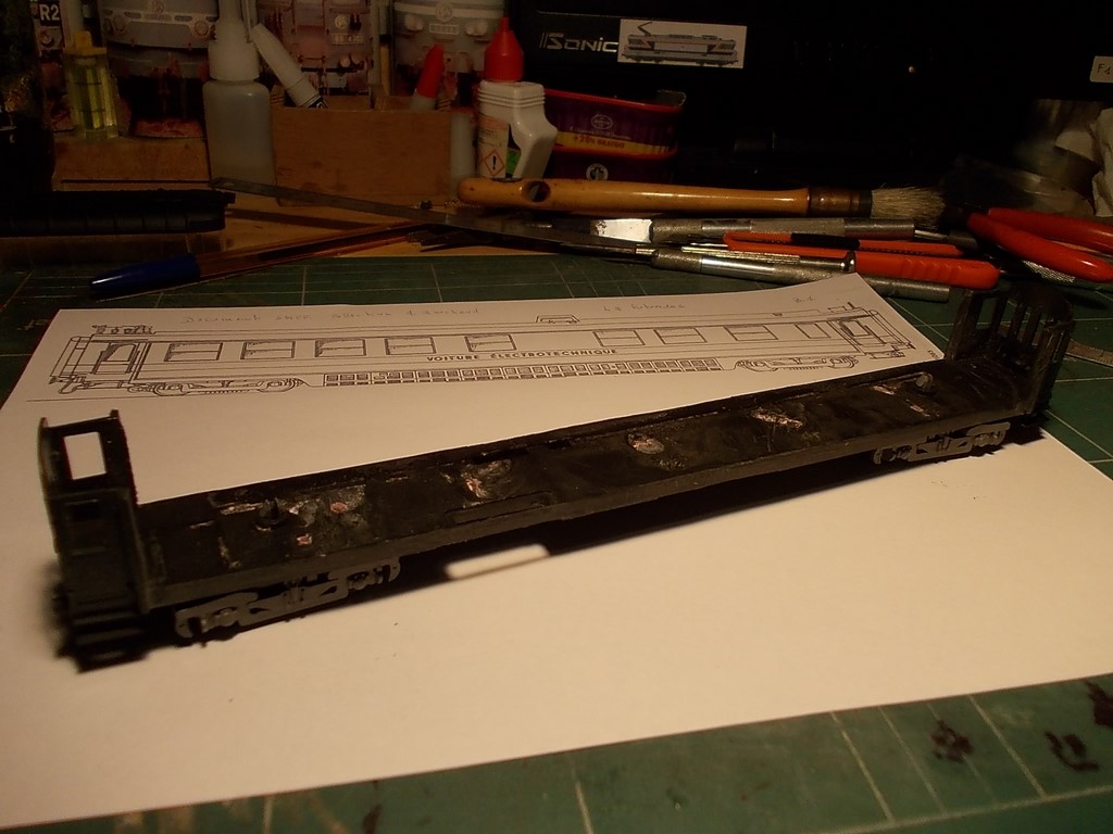 Commençons par la plus simple à réaliser. La voiture annexe N° 202, réalisée sur une base de voiture postale de 21,60 m Jouef avec un rallongement aux extrémités et une légère modification aux niveau des vitrages. ;)