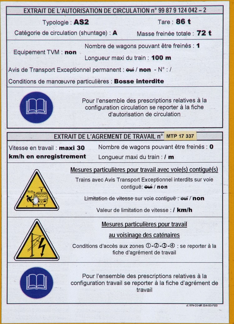 n° UIC 99 87 9 124 042-2 - Agrément de travail MTP 17 337 - 30-11-2017 / 30-11-2020 - Tare 86 T