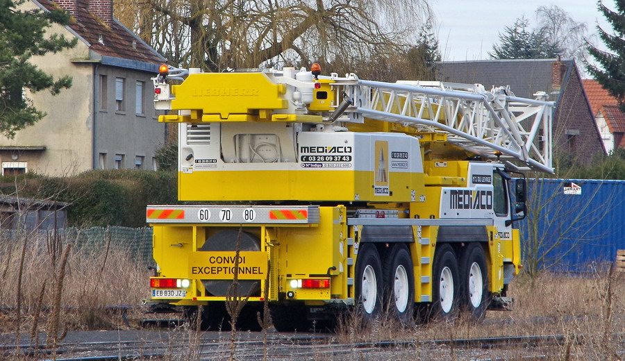 - une grue mobile LIEBHERR LTM 1100-4 de 100T pour le levage de la machine à Chaulnes le 06-03-2018