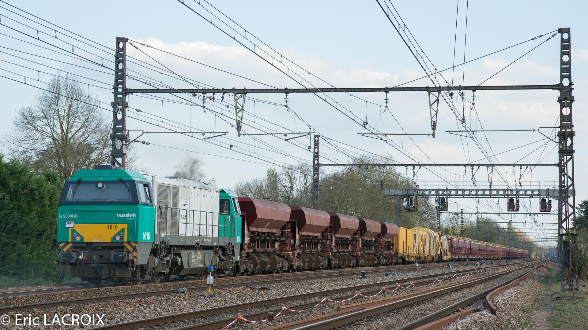 G 2000 BB 5001603 - 92 87 0 002 011-0 F - ETMF en tête du train de dégarnissage Matisa C-75 - 99 87 9 314 507-4 GCF Roma passe à Villeperrot (89) pour rejoindre la base de travaux de St Florentin. Avril 2017.