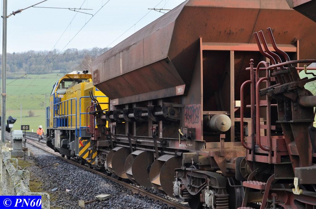 Reprenons le fil des travaux mais cette fois le 30 novembre 2017, un train tracté par une G.1206 de la Dijonnaise de Voies Ferrées intervient au niveau du PN60.