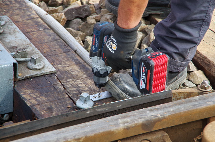 perçage du rail pour le montage d'éclisses à 6 trous entre l'ancienne et la nouvelle voie au niveau du PN n°92