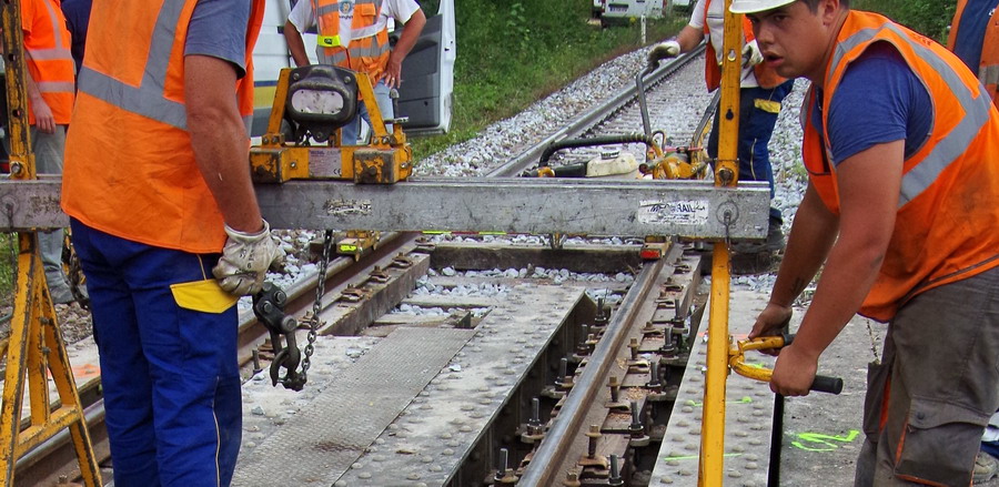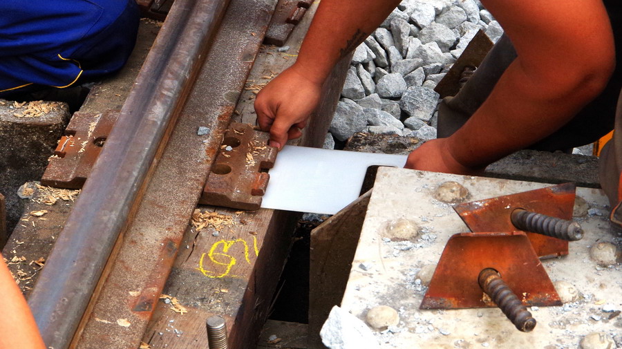 tirefonnage après recalage de la VU sur le pont ferroviaire avec des plaques en plastique à Rogny (02)
