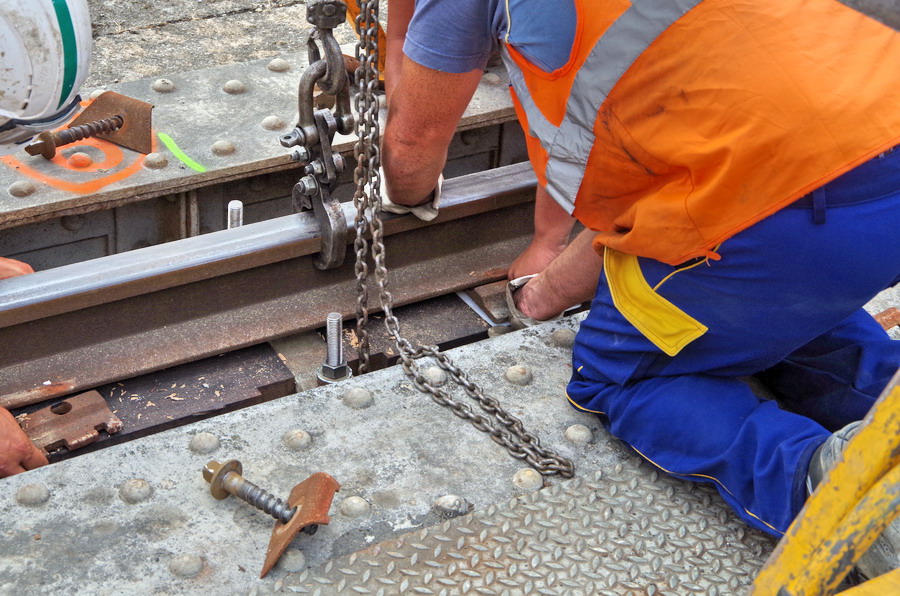 tirefonnage après recalage de la VU sur le pont ferroviaire avec des plaques en plastique à Rogny (02)