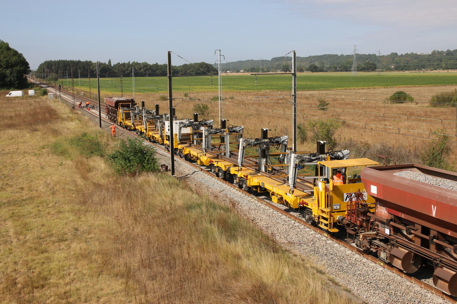 Le train de substitution, qui sert à remplacer les traverses et rails, a parcouru depuis 32 jours de chantiers environ 810 mètres par jour (il serait après Limeray)