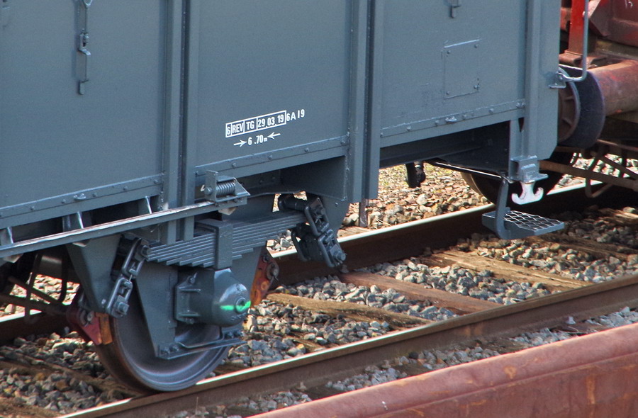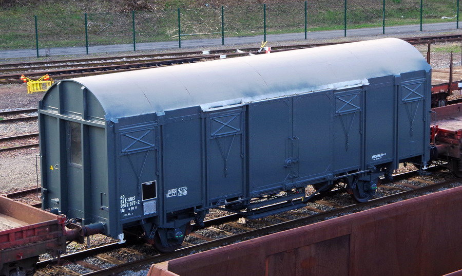 Wagon couvert 40 87 959 2 977-2 Us G90 6 F-SNCF sortant de révision du Technicentre de Tergnier avec une nouvelle livrée gris foncé