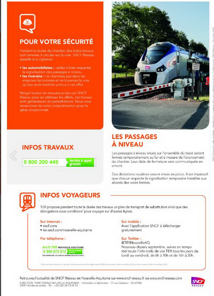 Afin d’assurer la pérennité de la section de ligne ferroviaire entre Libourne et Bergerac et de rétablir les performances nominales de la ligne, d’importants travaux de renouvellement de la voie sont réalisés entre janvier et septembre 2019. Cette opération est rendue possible grâce à l’engagement de la Région Nouvelle-Aquitaine, de l’Etat et de 16 collectivités territoriales aux côtés de SNCF Réseau. L’ensemble des partenaires est fortement mobilisé pour pérenniser et fiabiliser la desserte ferroviaire de l’ensemble des villes situées sur la ligne Libourne – Bergerac – Sarlat.