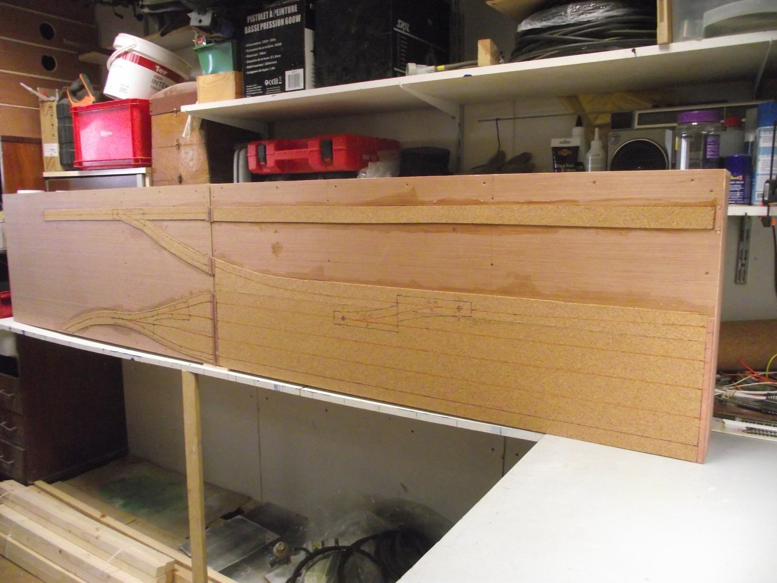 pour l'instant 10 modules (partie gare) sont assemblés sur les 17, les 5 modules de la partie voies de garage sont en cours de pose du liège