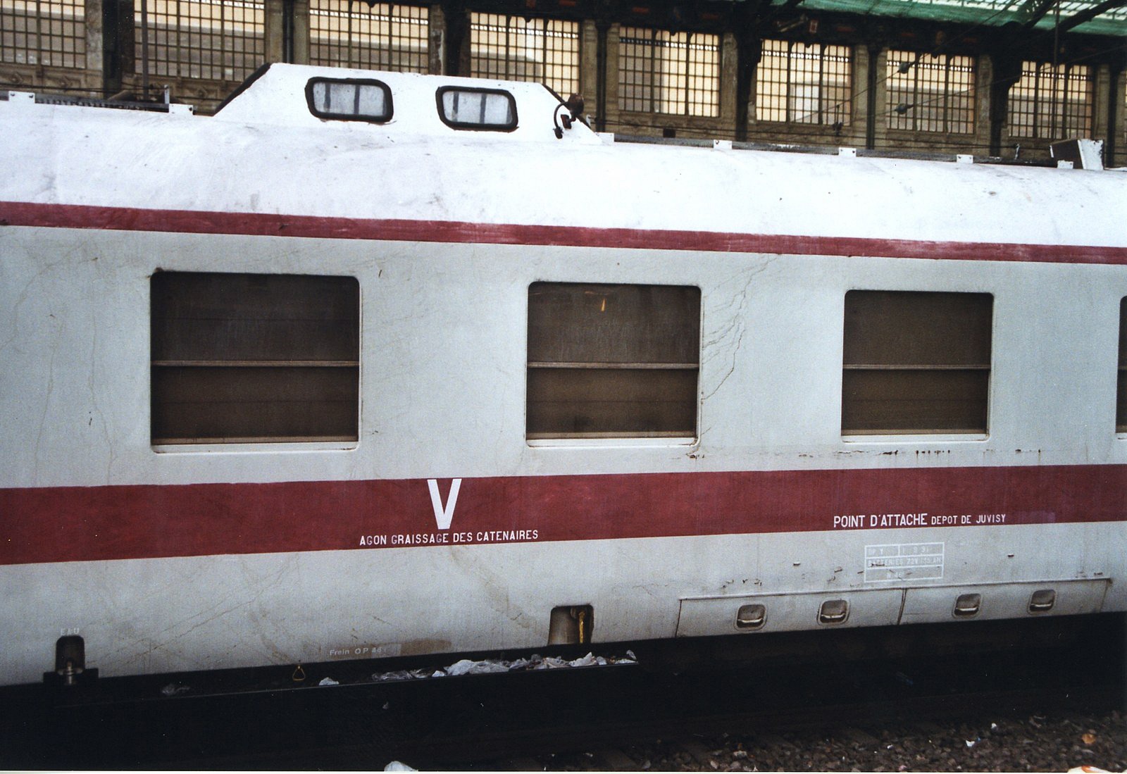 Voici quelques images de l'ex DEV AO devenue wagon graisseur de caténaire 80 87 979 0 402-2 RO, saisi en Gare de Lyon Novembre 2003.