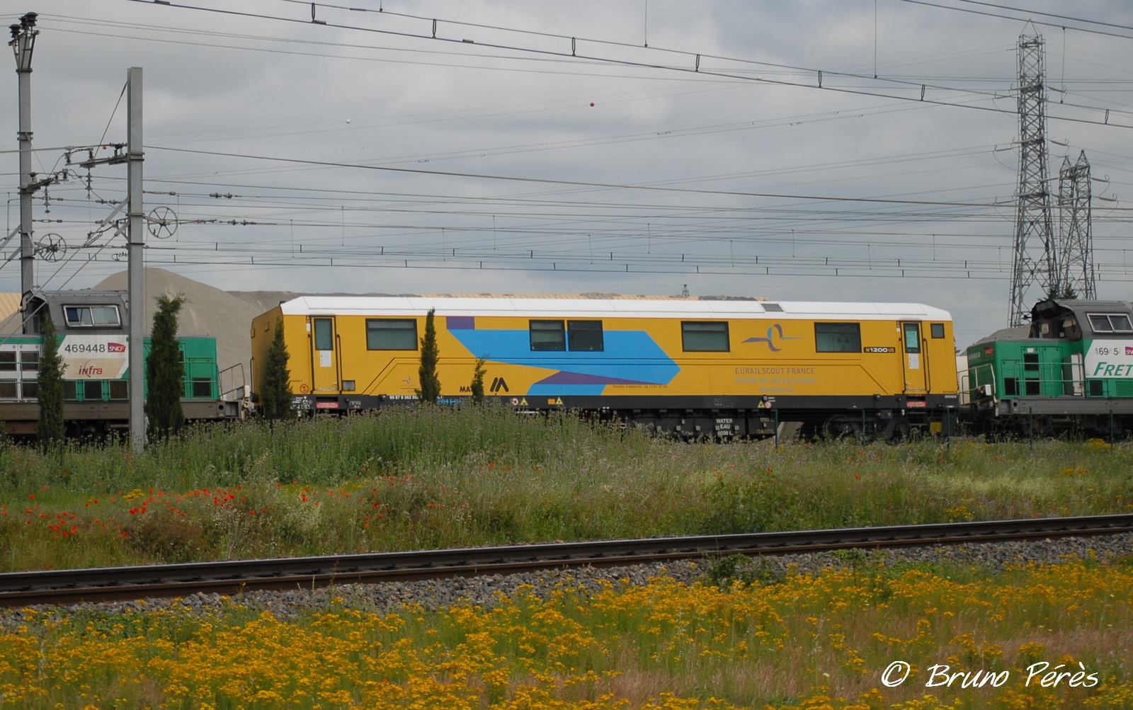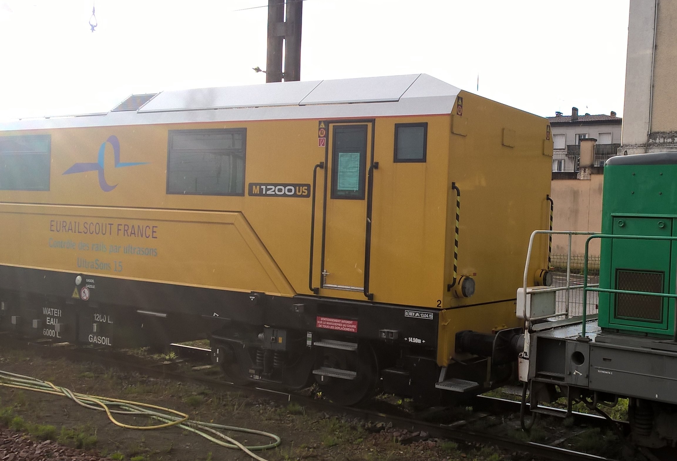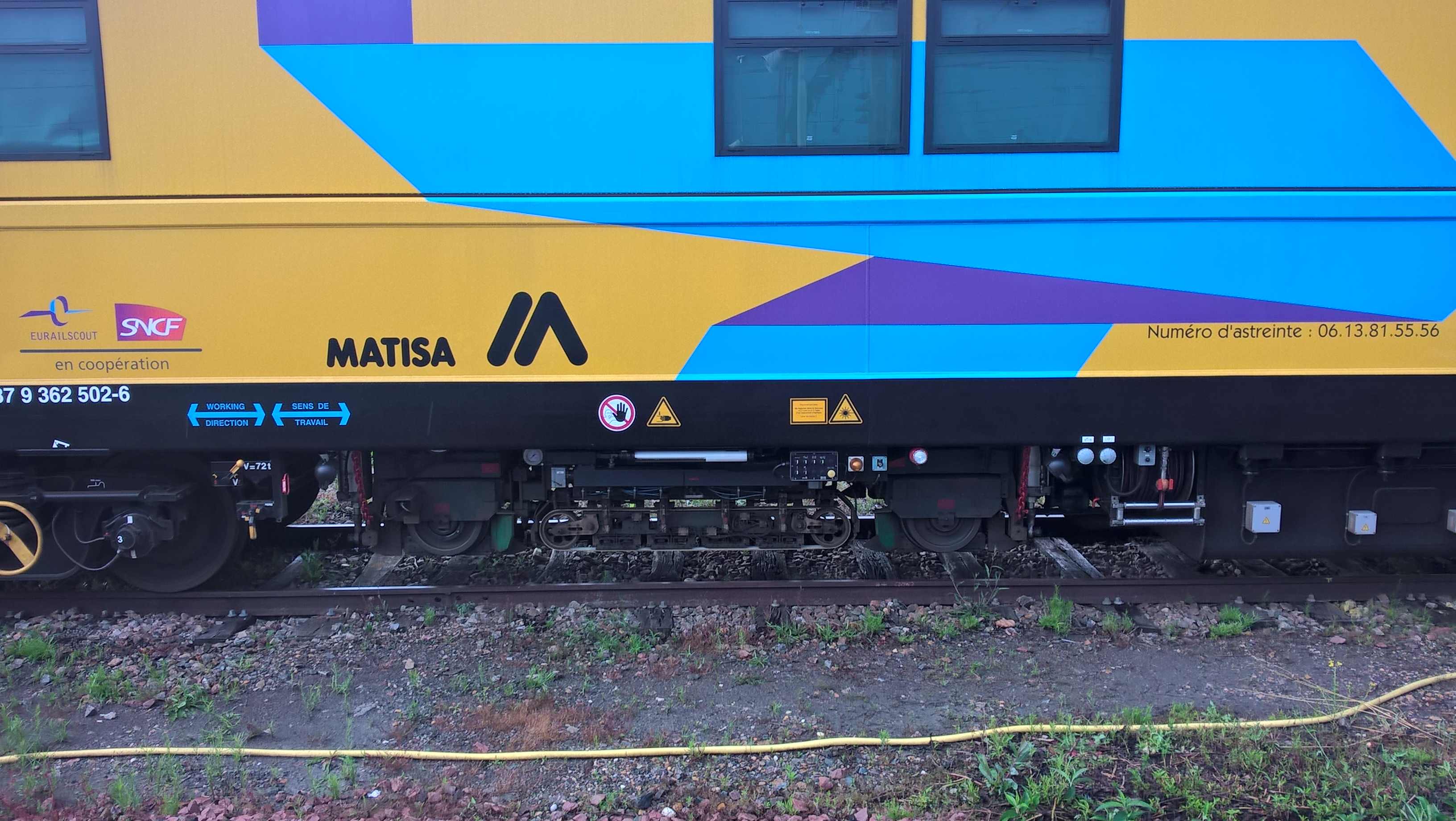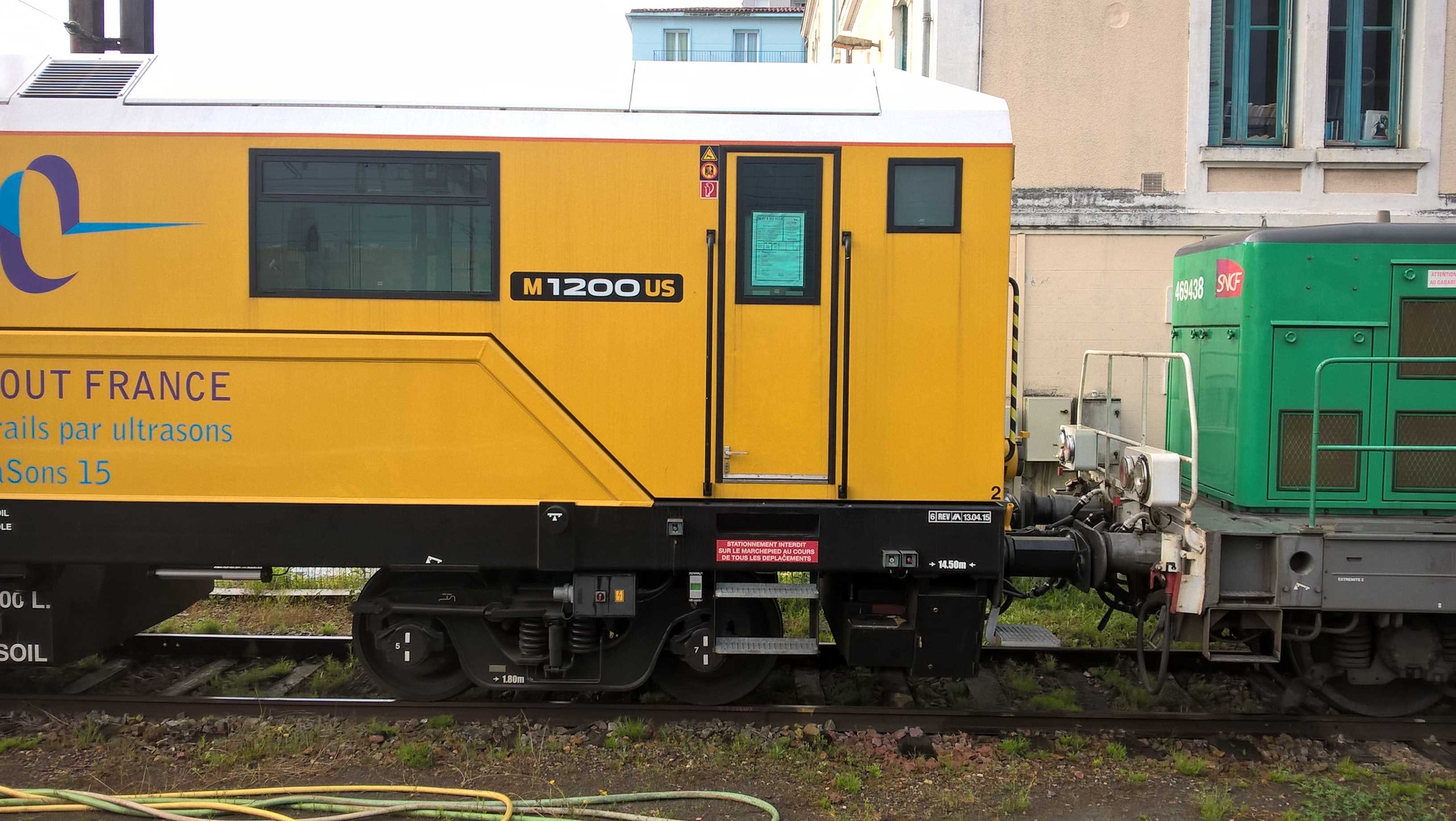 Voici une voiture de contrôle ultrason des rails toute neuve. elle est construite par Matisa (modèle M1200US). Ce serait la voiture V15 selon le marquage. Elle est exploitée en joint-venture entre la SNCF et Eurailscout suite au rapprochement des deux sociétés. Vue à angoulême le 15 juin 2016.
