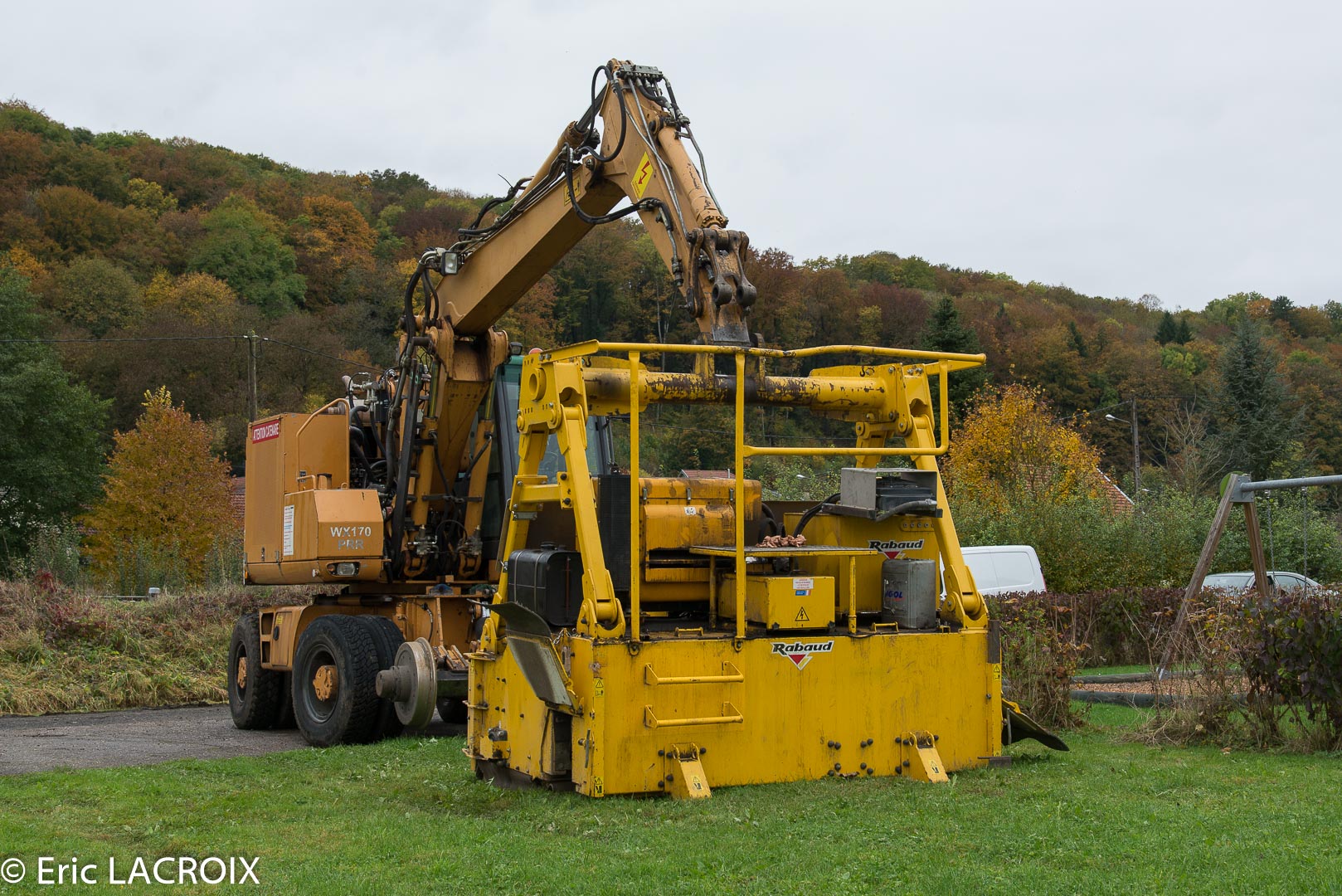 PRR CASE WX170 D2R de l’entreprise Fornoni équipée d'une balayeuse à ballast RABAUD à Tilleux (88) en octobre 2016.