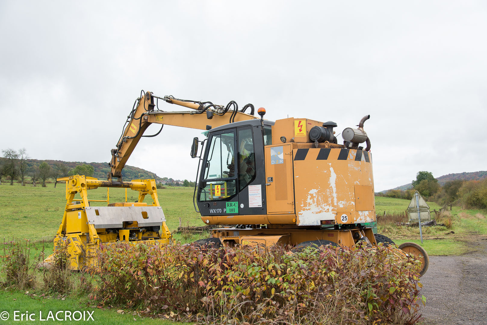 PRR CASE WX170 D2R équipée d'une balayeuse à ballast RABAUD à Tilleux (88) en octobre 2016.