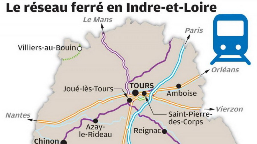 > Étoile. En Indre-et-Loire, la gare de Tours rayonne en étoile vers plusieurs directions avec une belle densité de dessertes vers Nantes, Orléans-Paris, Bourges, Bordeaux (TGV-TER en partie) sans oublier les lignes