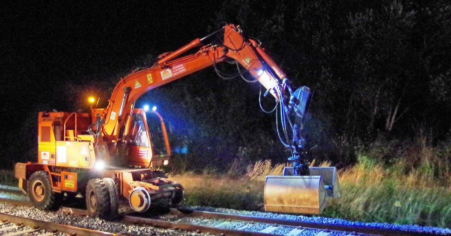 à Jussy (02) avec la présence de deux Pelles Rail route Colas Rail et d'une Bourreuse ETF