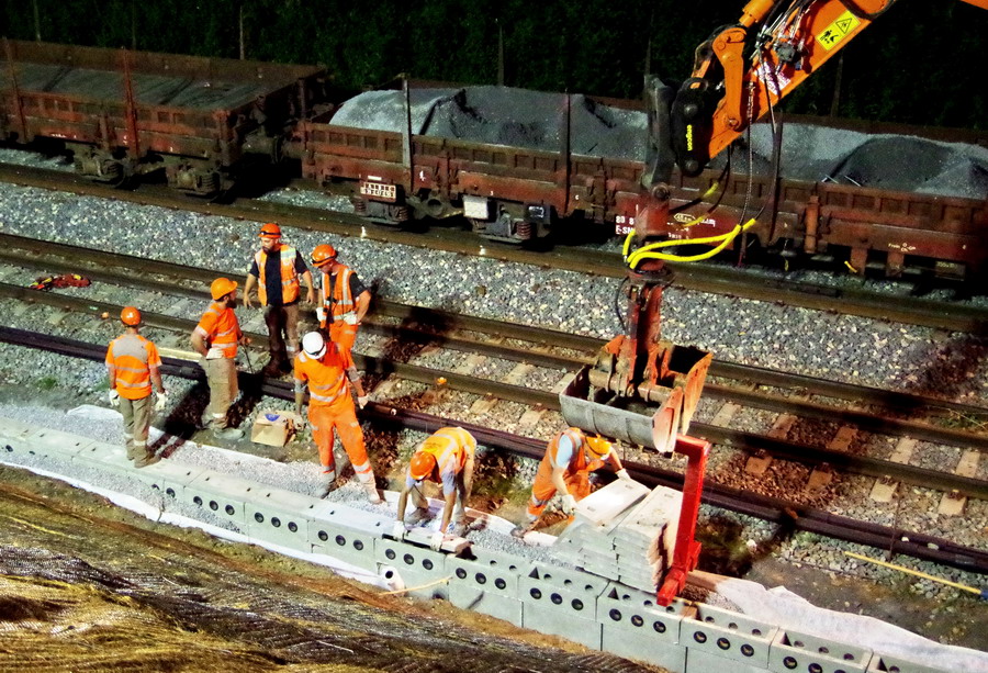 nuit du 26 au 27 juillet 2018 avec le travail pour l'installation des caniveaux par Colas Rail au niveau des ponts de Bray à