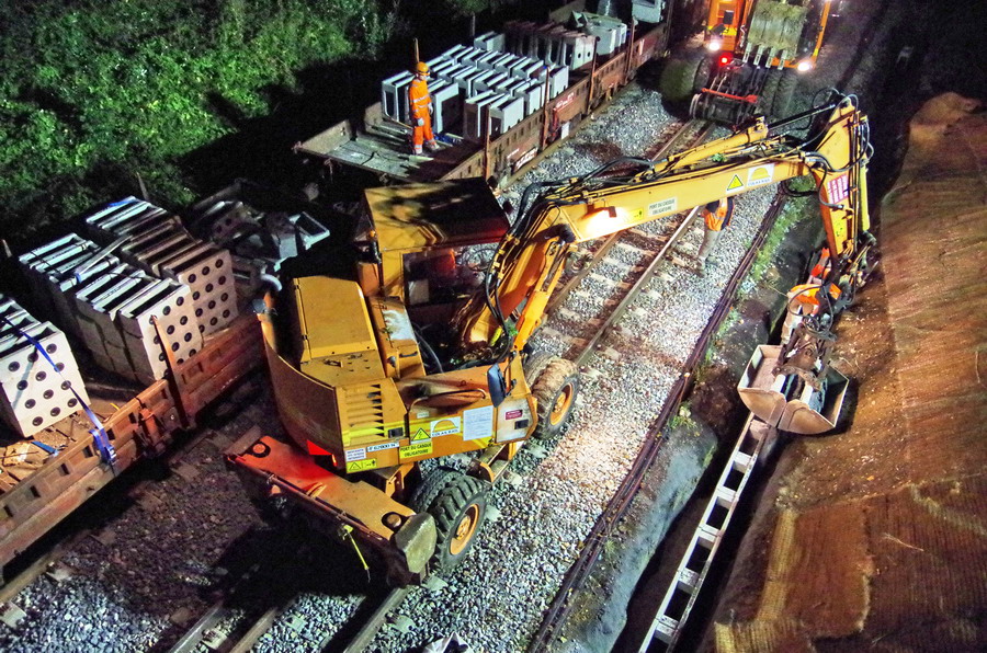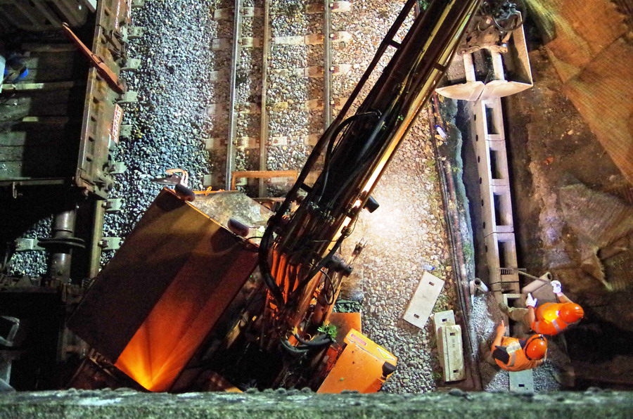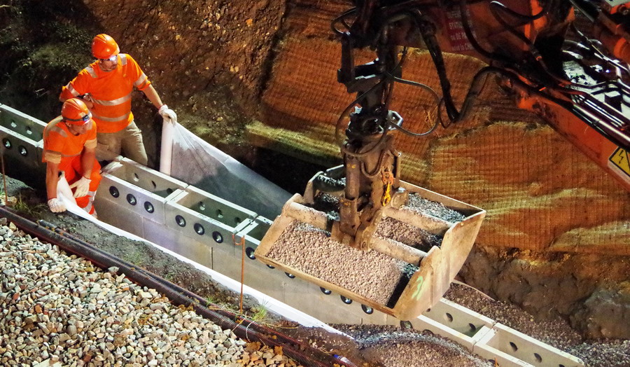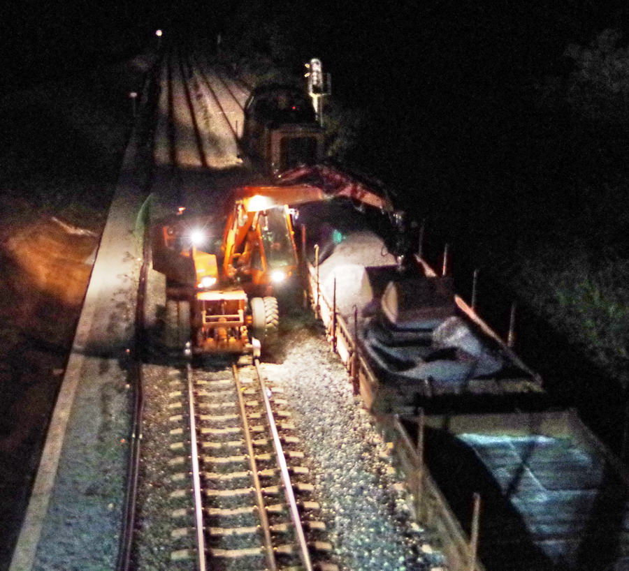 avec la présence des deux Pelles Rail route Colas Rail pour les travaux de caniveau