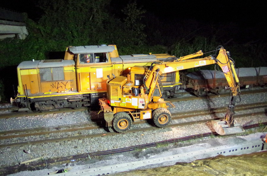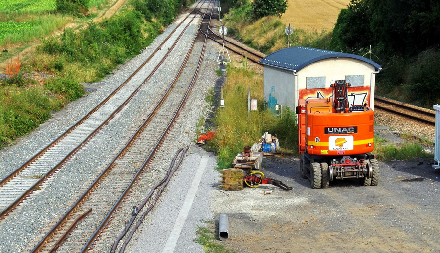avec la présence des deux Pelles Rail route Colas Rail pour les travaux de caniveau