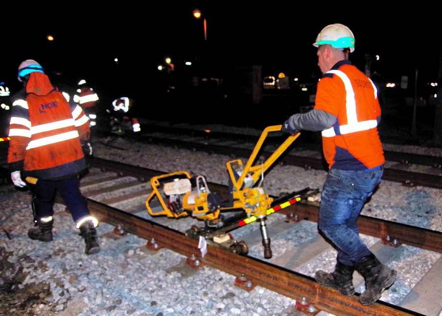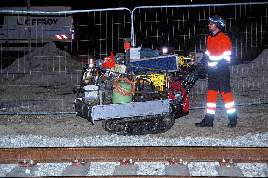 passage d'une décalamineuse de rail après la Soudure Aluminothermique et le meulage au PN 58 à Chauny