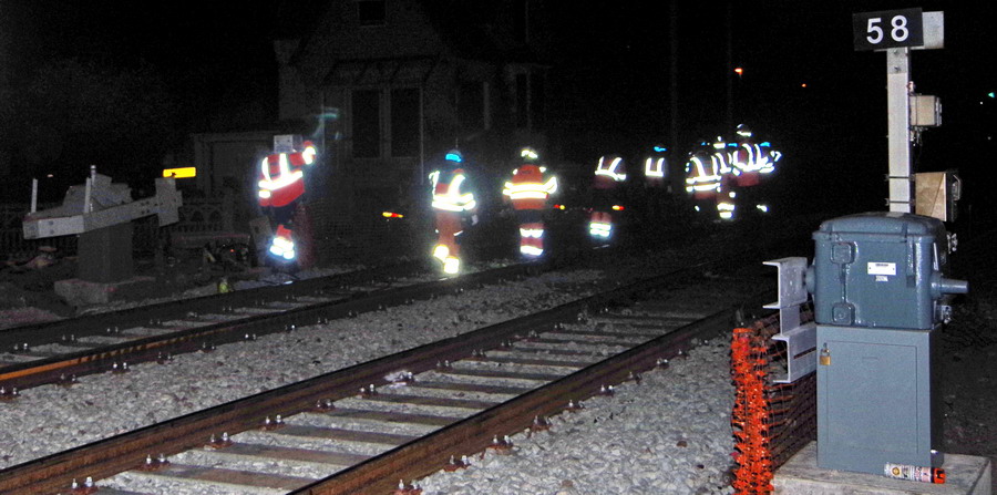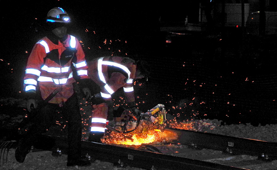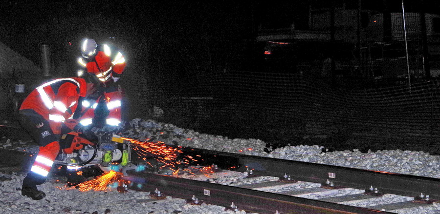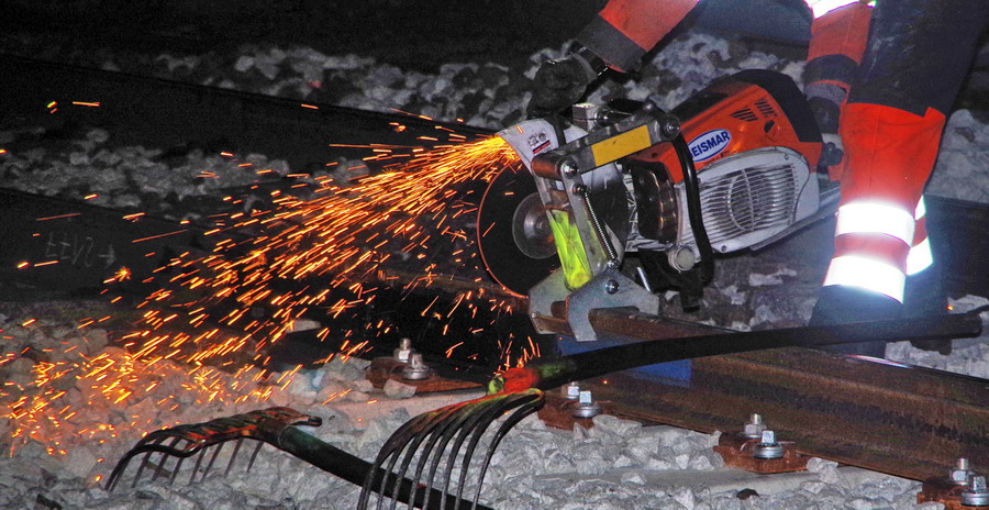 séance de découpe avec une tronçonneuse du rail au PN 58 à Chauny nuit du 25 au 26-04-2019