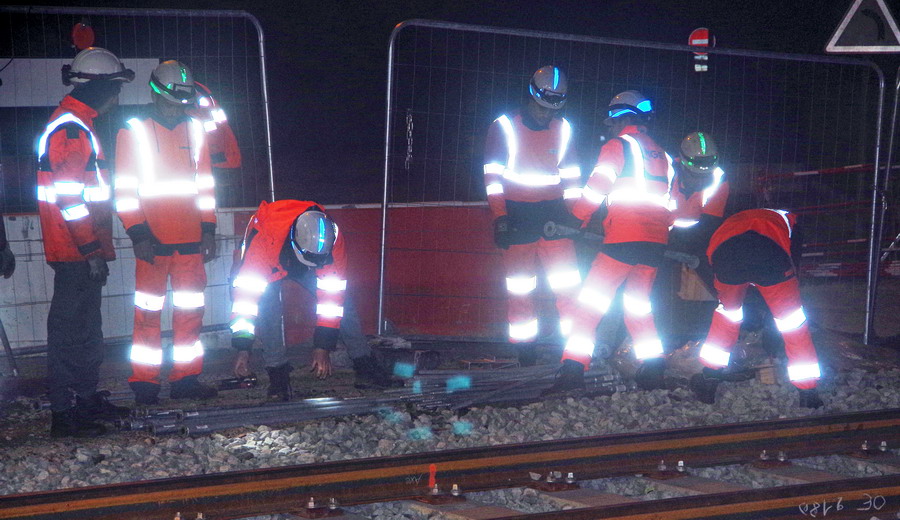 préparation pour le montage avec des tiges pour la fixation des plaques de STRAIL pour le PN 58 à Chauny nuit du 29 au 30-04-2019
