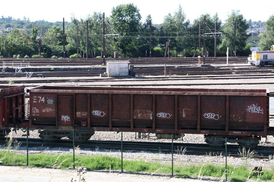 wagon tombereaux de type E74 sur la base de travaux du Puy-Imbert le 10-07-2019