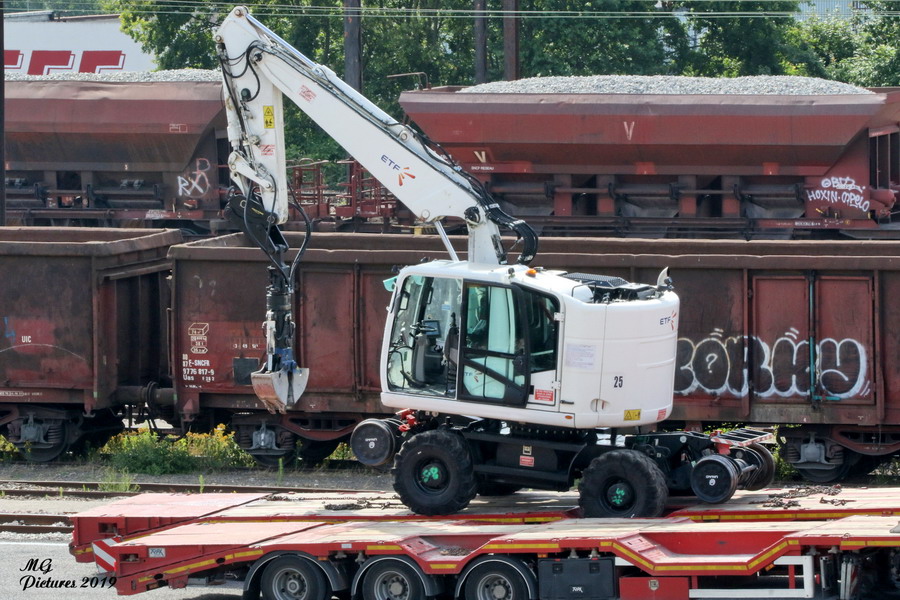 arrivée d(une Pelle Rail route UNAC 22TRR d'ETF sur la base de travaux du Puy-Imbert le 16-07-2019
