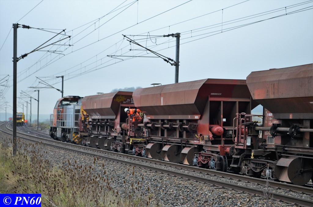 Une centaine de mètres derrière le train de dégarnissage COLAS RAIL RM 900-HD 100 AHM en action à Brainville sur Meuse le 16 novembre 2017, un second train de wagons trémies poussé par la G.1206 99 87 9 181 537-1 de la Dijonnaise de Voies Ferrées fait un apport en ballast neuf. Ce train est dirigé par radio par un agent posté sur le premier wagon plat situé en tête.