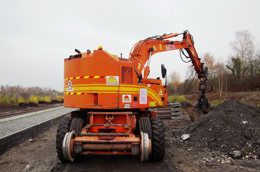 Pelle Rail route Unac 22 TRR n°CATM15DAJ5B00350 Colas Rail sur la base de travaux arrière à Longueau le 07-12-2018