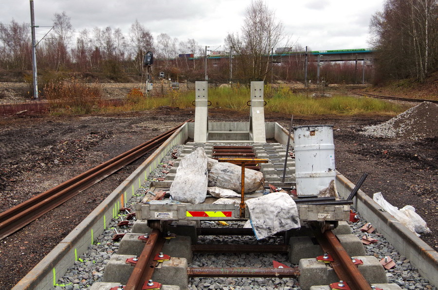montage d'un heurtoir sur la nouvelle voie en estacade de 500 m de long sur la base de travaux arrière à Longueau