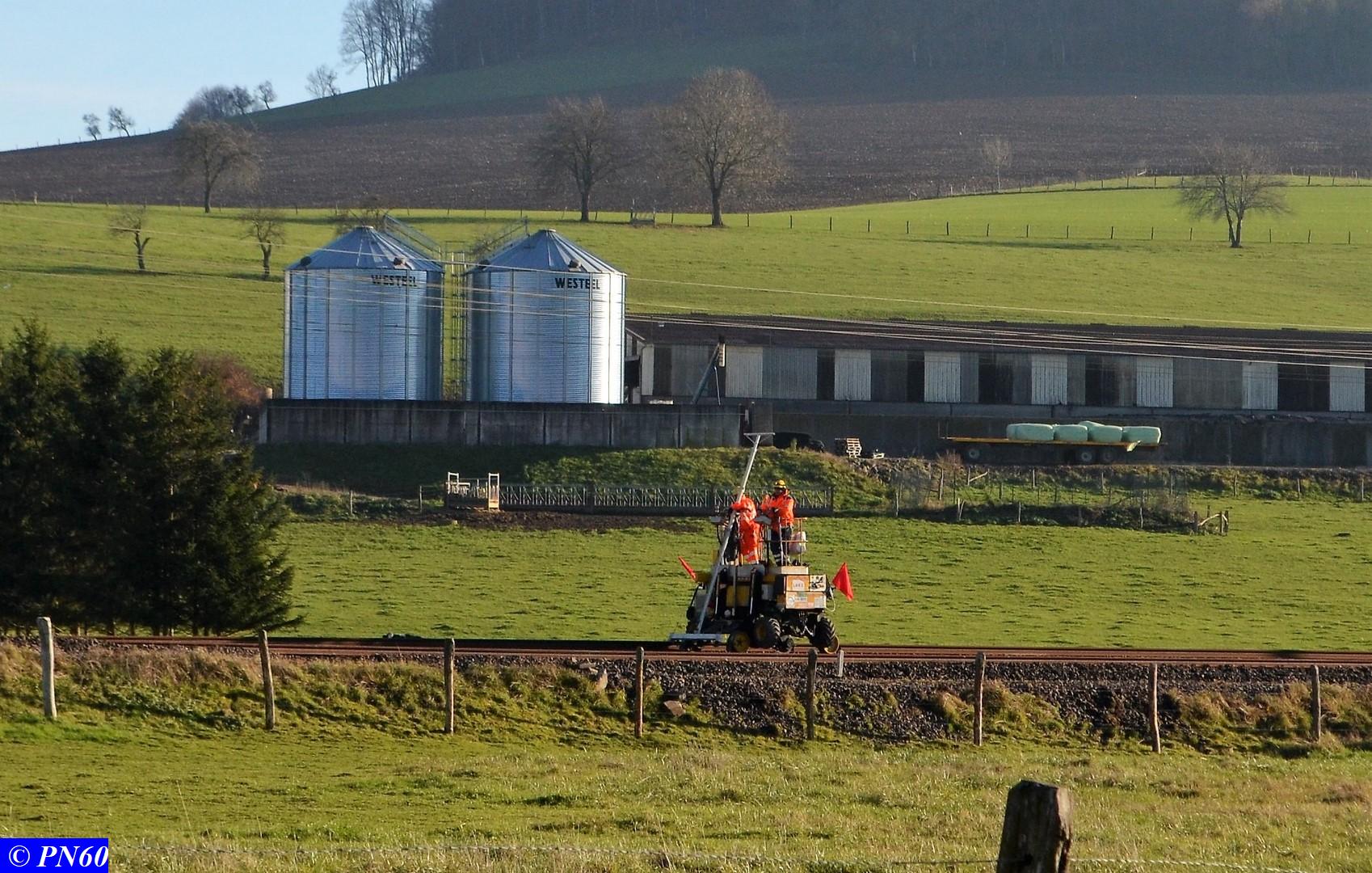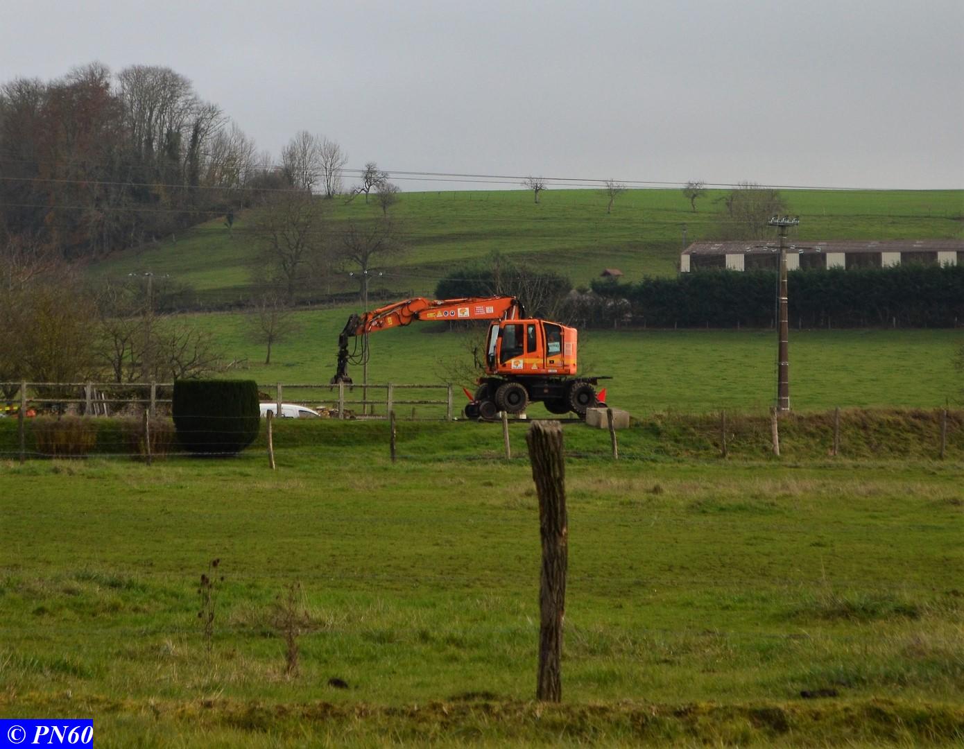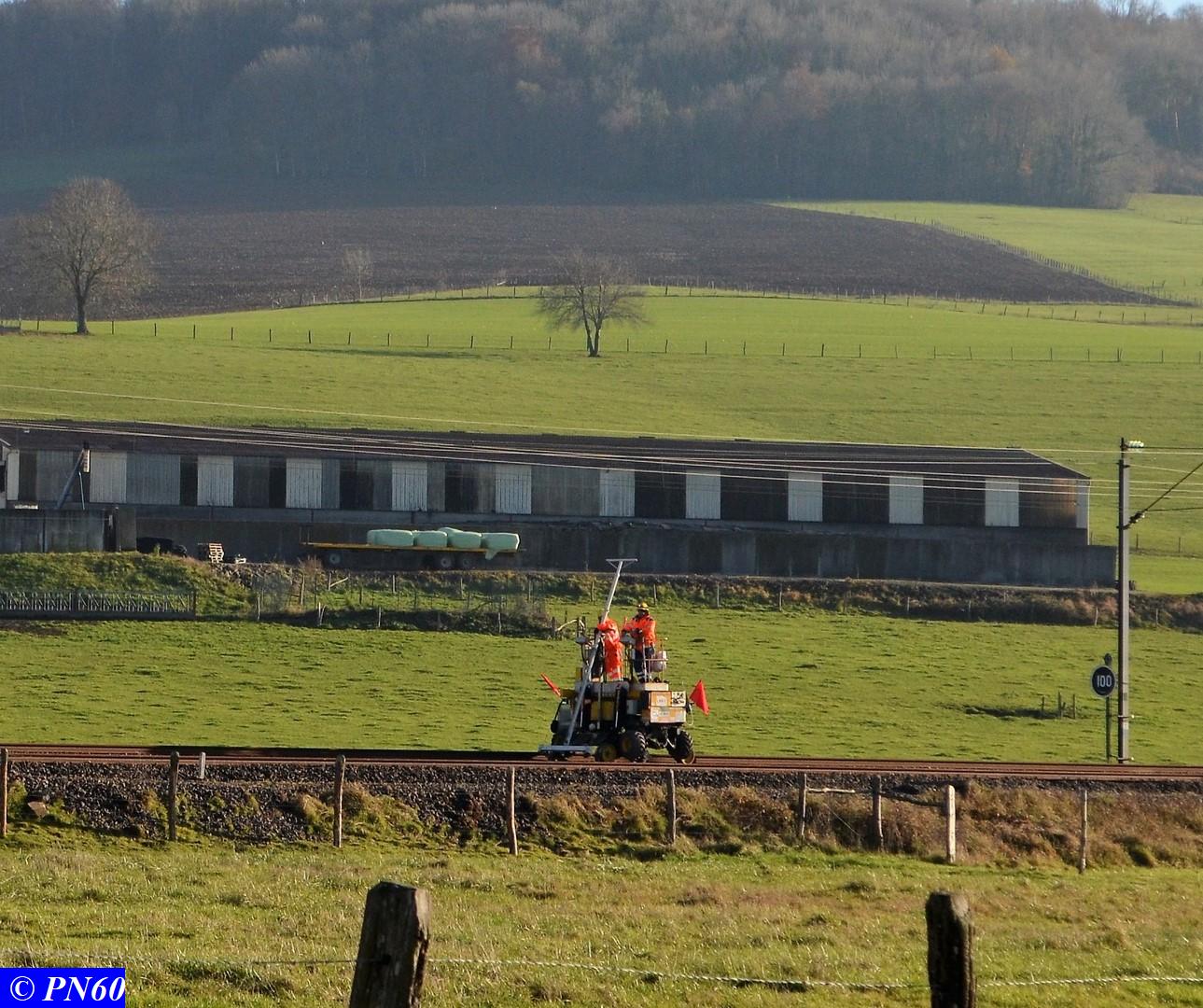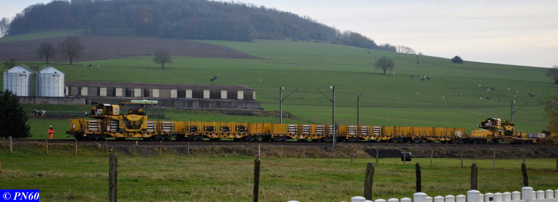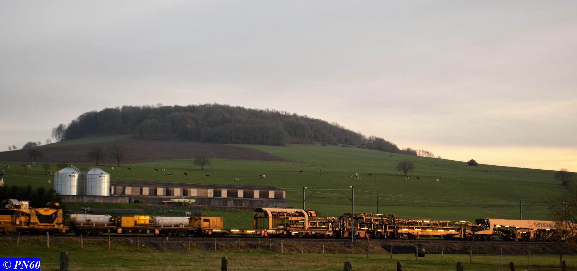 Dernières photos prises le 21 novembre 2017 : une pelleteuse sur rail officie au niveau du PN 60 - le train de coupe TSV 21 GP - 99 87 9 311 502-8 - Gipérail autonome en fonctionnement suivi d'un train de ballast avec ses wagons éclairés par des néons à la tombée du jour.