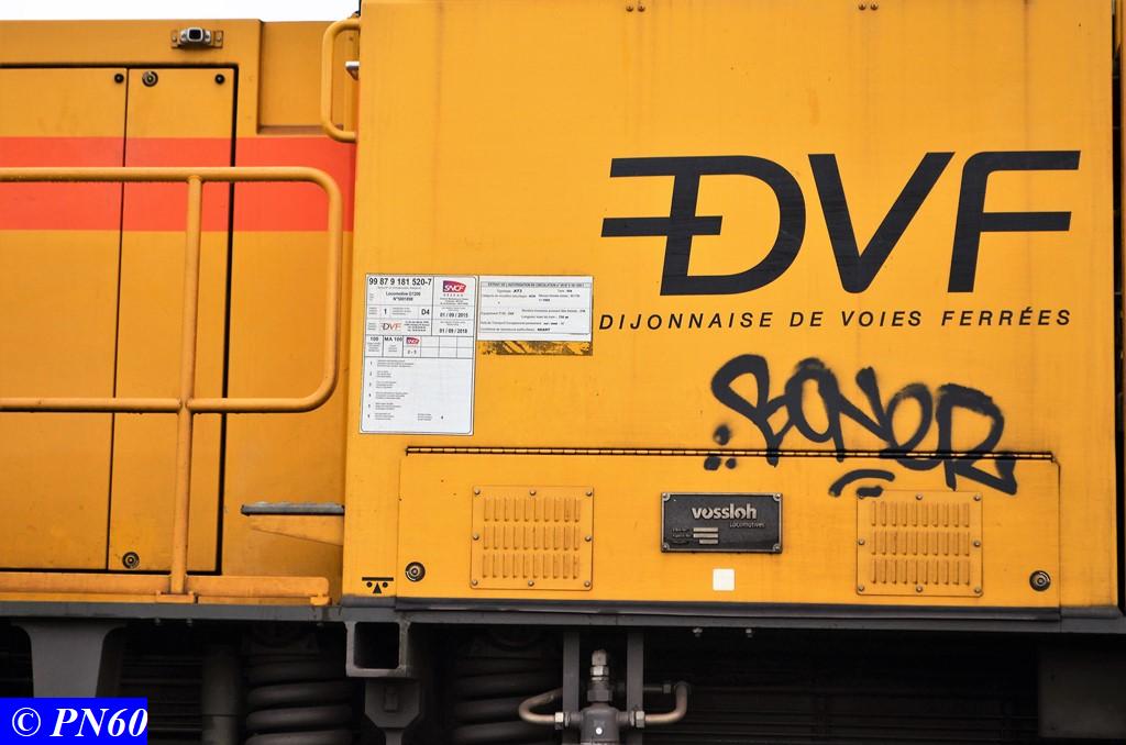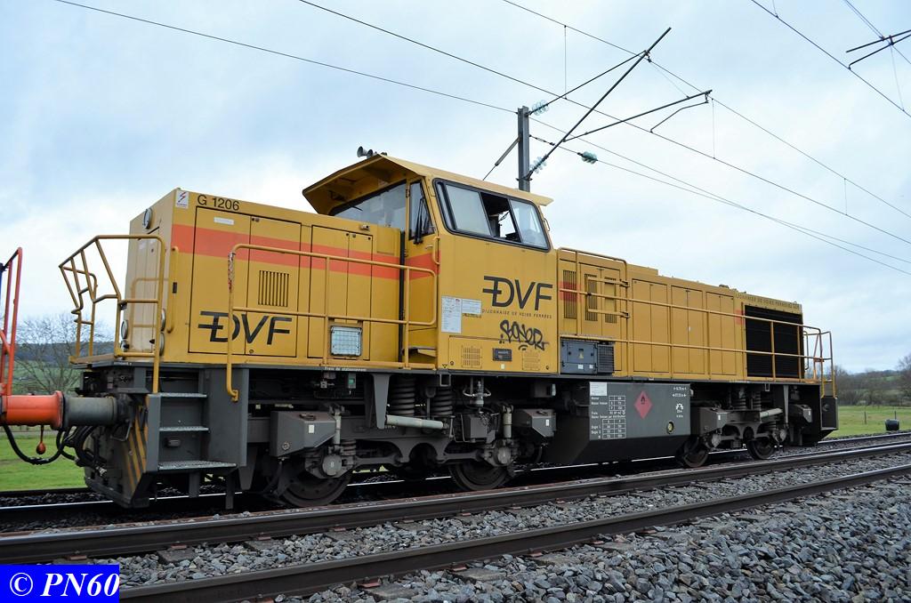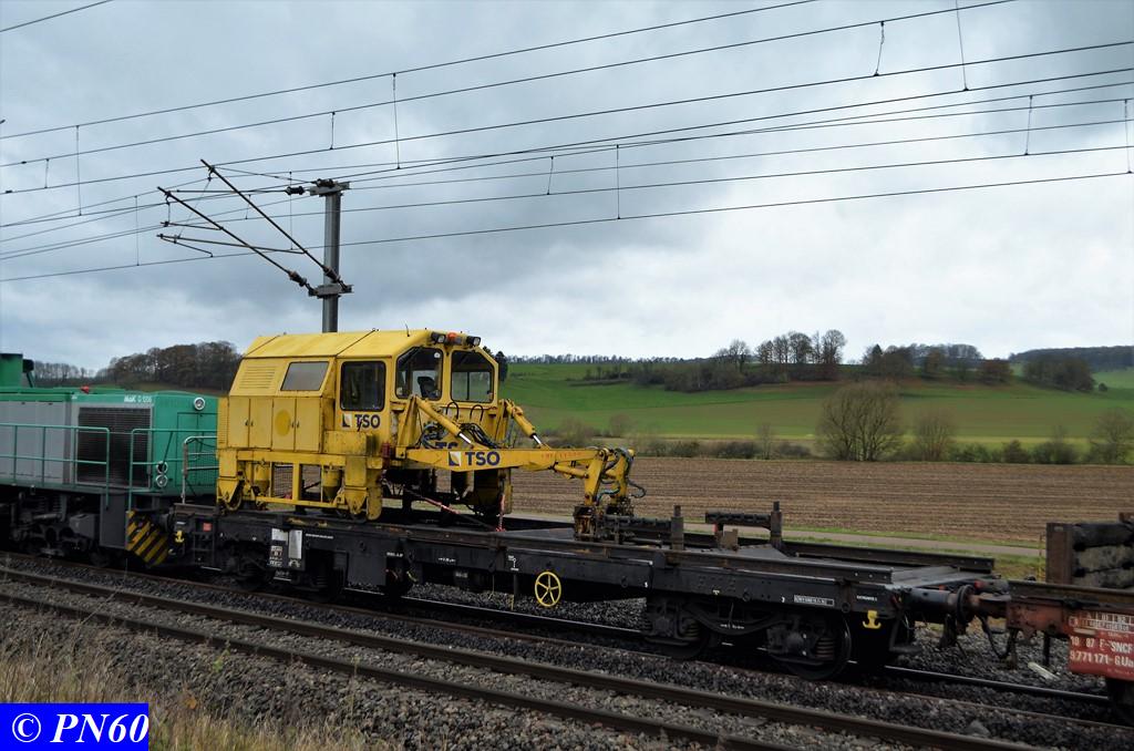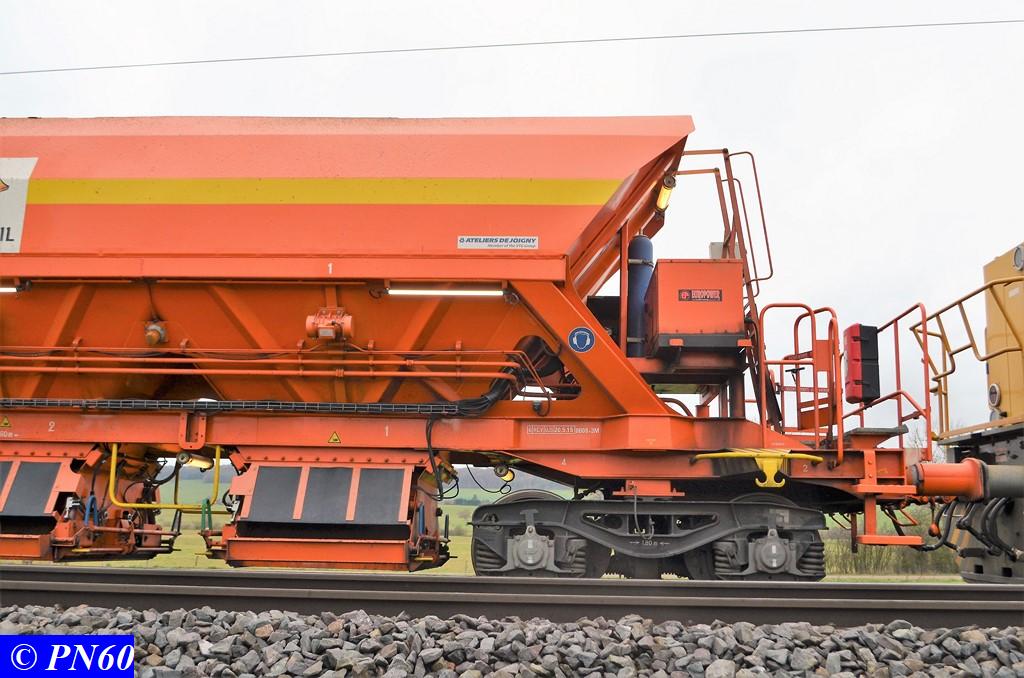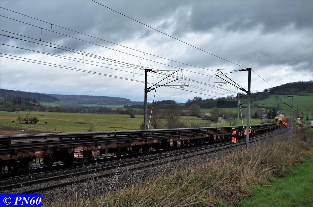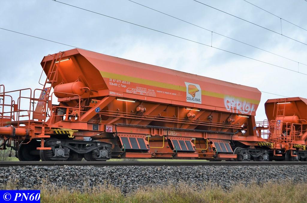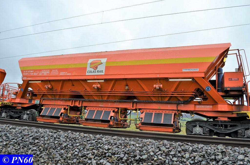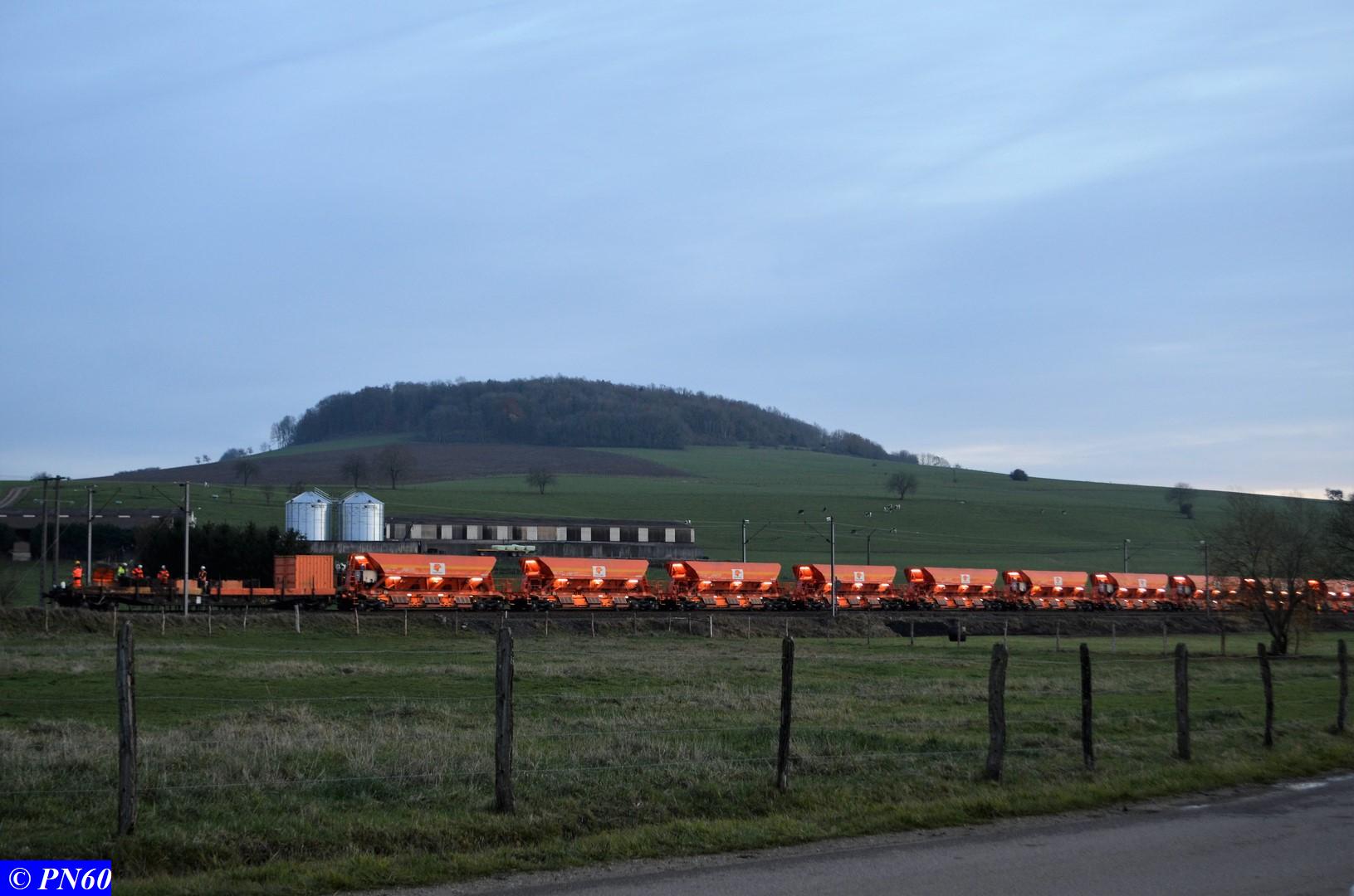 Ce dernier est tracté par la G.1206 n° 99 87 9 181 520-7 de la Dijonnaise de Voies Ferrées. Il est composé de ces fameux wagons à bogies orange Colas Rail équipés de néons.