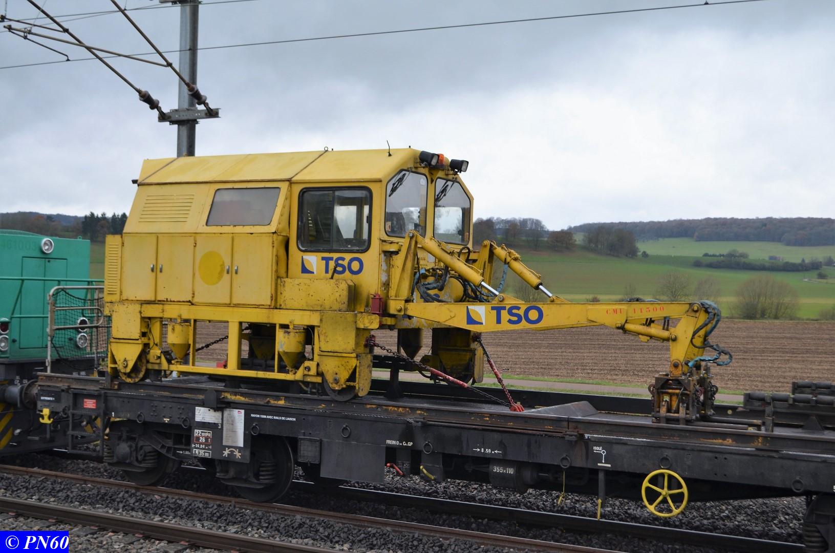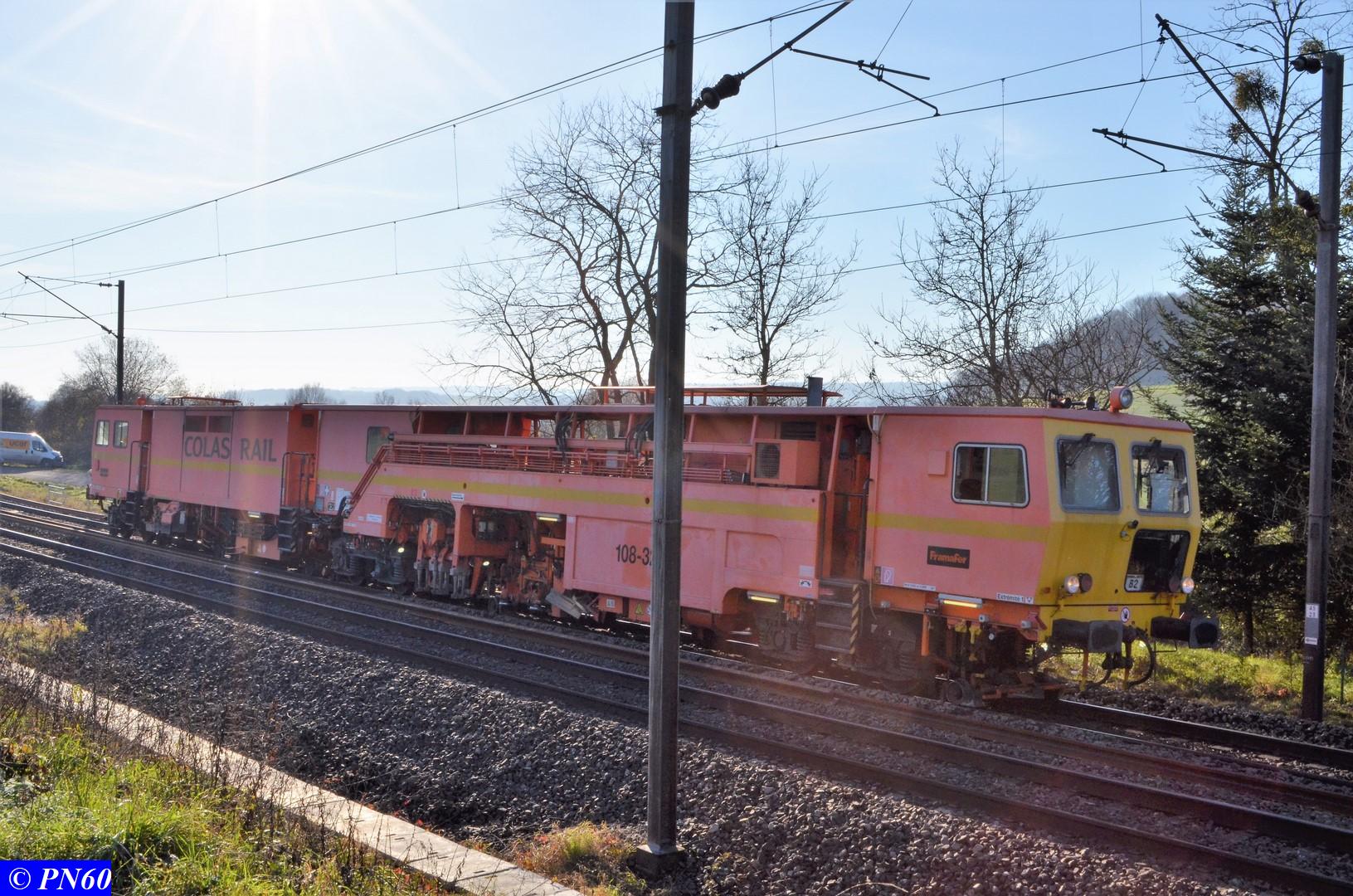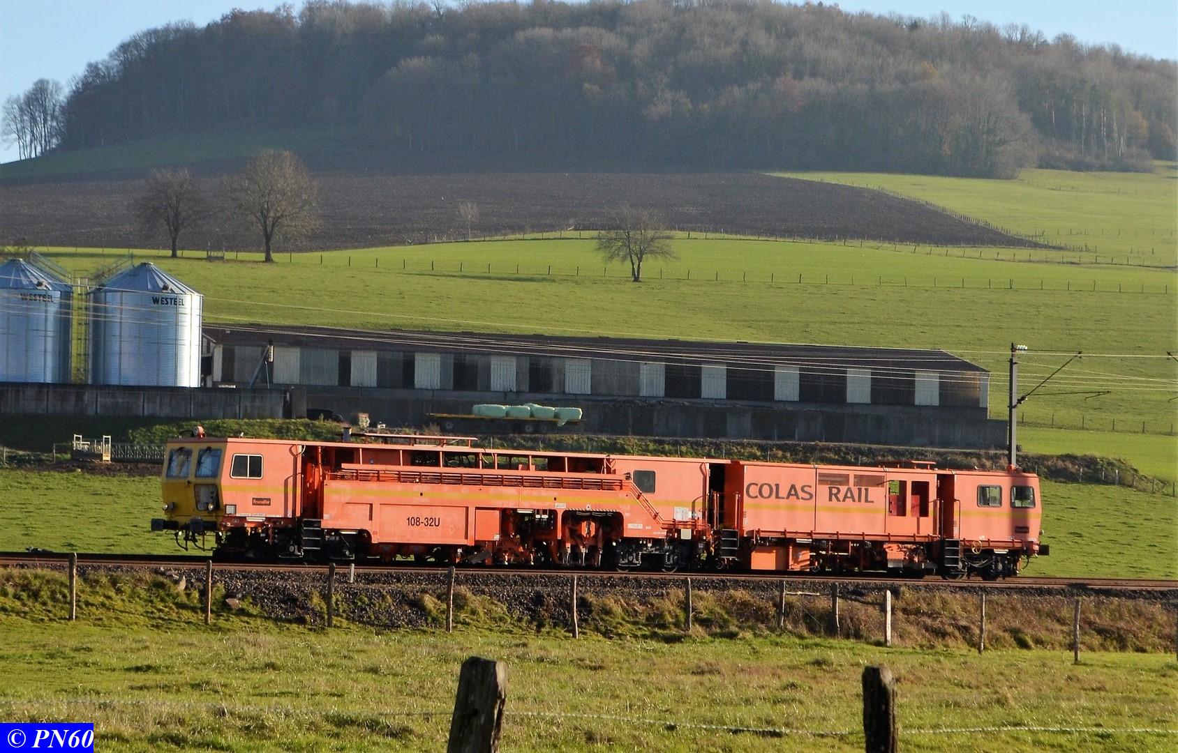 Le 22 novembre 2017 après le passage du train de coupe TSV 21 GP - 99 87 9 311 502-8 - Gipérail, une bourreuse de ligne 108 32U de COLAS RAIL intervient sur la voie fraîchement posée.