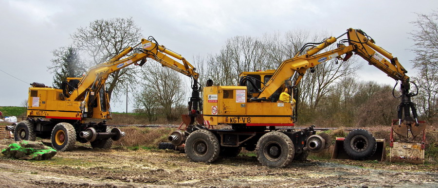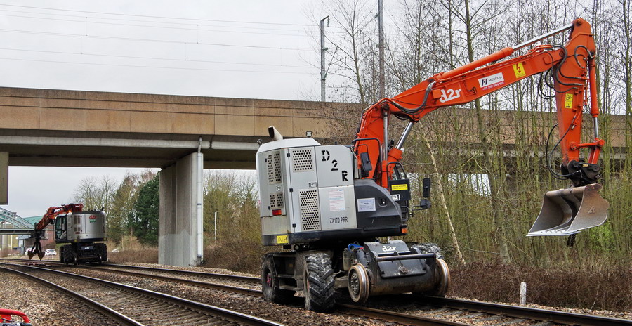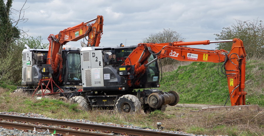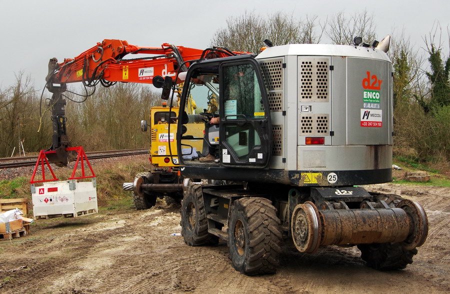 les deux pelles Rail route Hitachi D2R ZX 170 PRR d'ENCO en location par Meccoli à Puzeaux le 03-04-2018