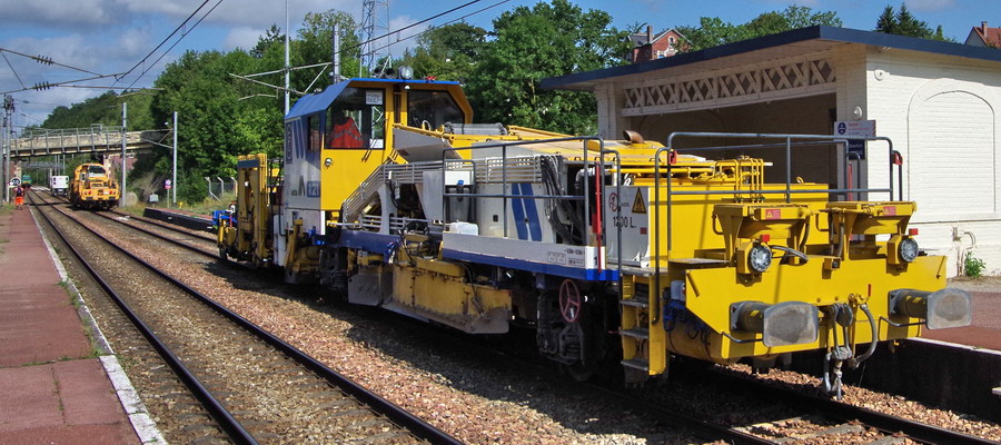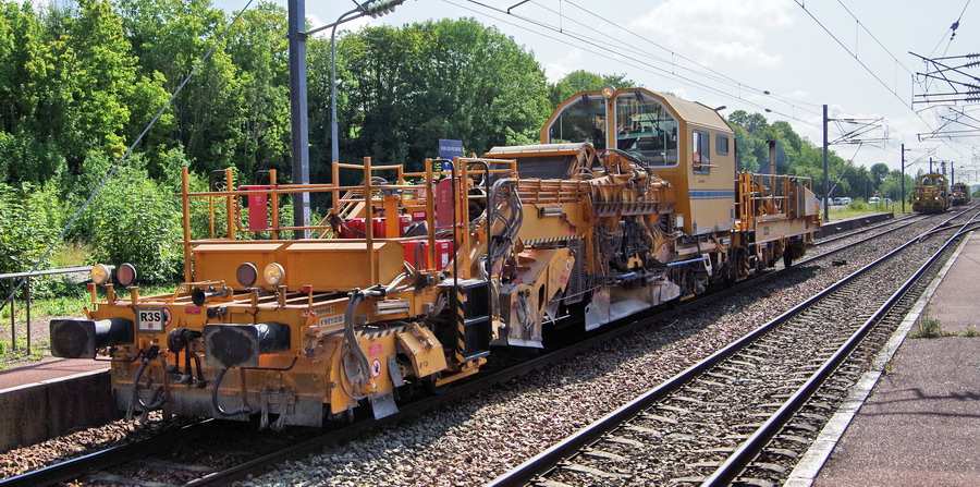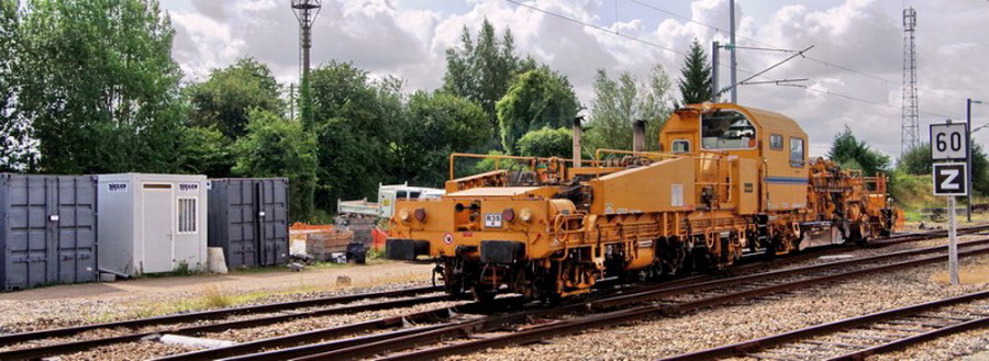 et maintenant sortie des engins de régalage et de bourrage de la base de travaux de la gare de Poix de Picardie pour