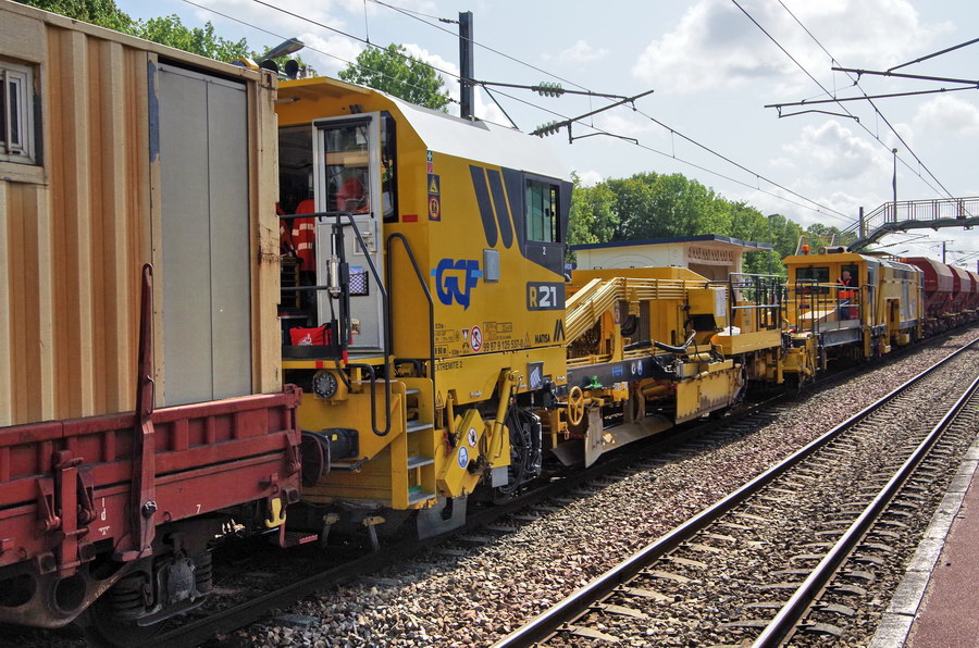 Régaleuse R21 Matisa n°47077 - 99 87 9 125 537-0 - GCF sur le train de ballast en gare de Poix de Picardie le 20-08-2019