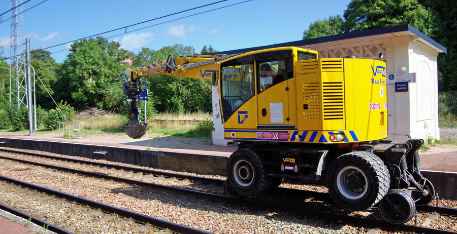 la présence sur la base de travaux de la gare de Poix de Picardie de 3 Pelles Rail route pour le chantier du RVB