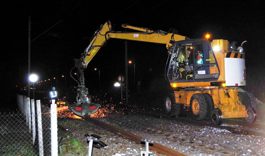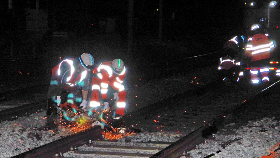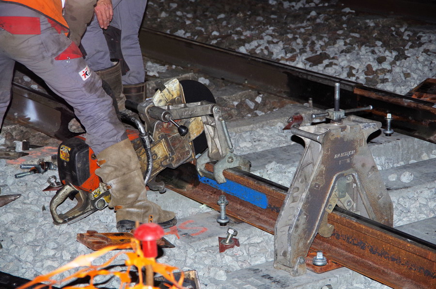 séance de découpe avec une tronçonneuse du rail au PN 58 à Chauny nuit du 23 au 24-04-2019