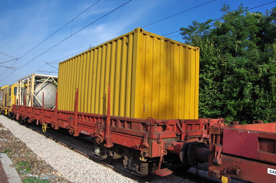 - Wagon plat 33 87 3936 162-8 Res RIV F-ERSA avec citerne et container jaune