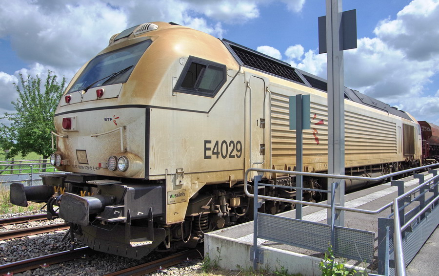 train n°K3K4 avec la E 4029 - 92 87 0 004 029-0 F-ETF et une rame de Trémies D12 en gare de Marcelcave (80) PK 21,100