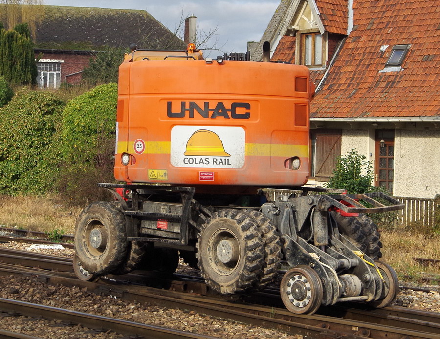 au premier PN de l'entrée de la commune avec une Pelle Rail route UNAC 22 TRR - CATM315DLW5M05000 de Colas Rail