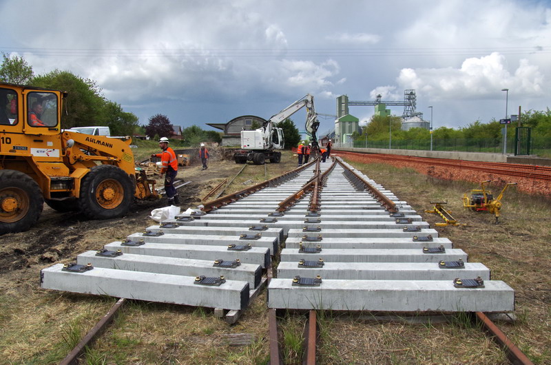 - fixation par des tirefonds ou boulons avec des rondelles, des traverses en béton sur le rail avec système crapaud