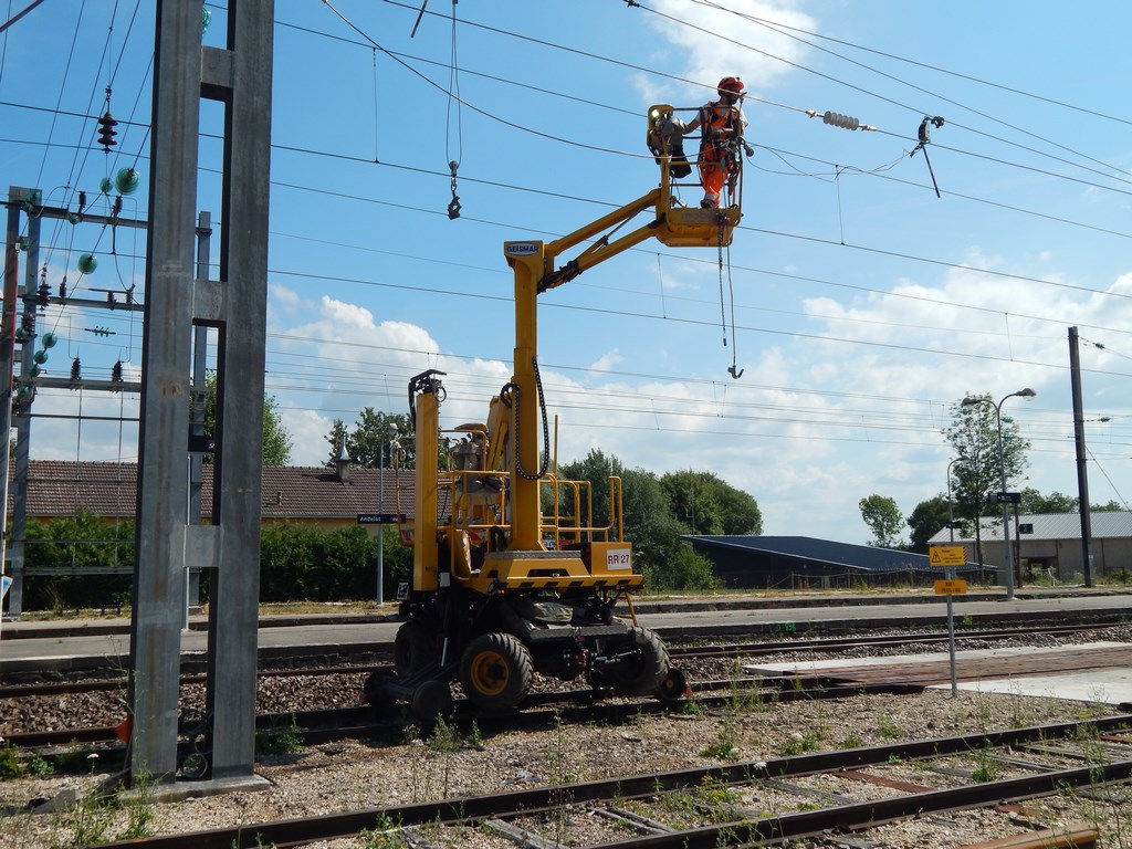 le 18/7/2018 Colas rail intervient sur la caténaire en gare d'Andelot en montagne (39)