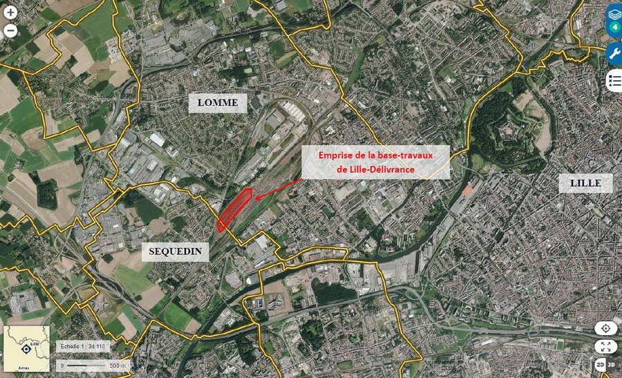 plan de Lille avec la base de travaux de la LGV Nord de Lille-Délivrance à Lomme