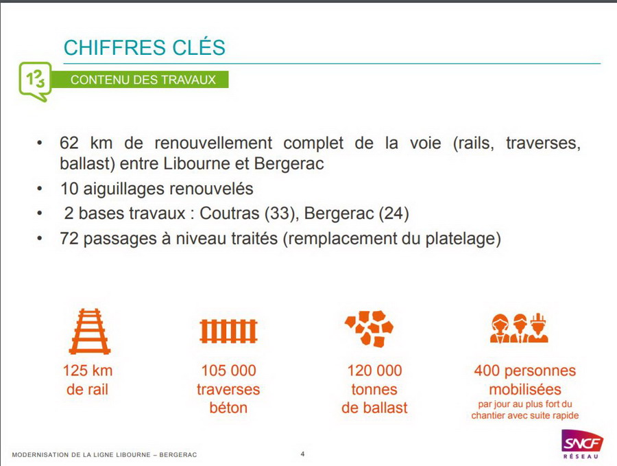 Afin d’assurer la pérennité de la section de ligne ferroviaire entre Libourne et Bergerac et de rétablir les performances nominales de la ligne, d’importants travaux de renouvellement de la voie sont réalisés entre janvier et septembre 2019. Cette opération est rendue possible grâce à l’engagement de la Région Nouvelle-Aquitaine, de l’Etat et de 16 collectivités territoriales aux côtés de SNCF Réseau. L’ensemble des partenaires est fortement mobilisé pour pérenniser et fiabiliser la desserte ferroviaire de l’ensemble des villes situées sur la ligne Libourne – Bergerac – Sarlat.