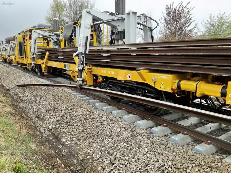 Les longs rails neufs sont progressivement mis en place, fixés sur les traverses et soudés entre eux