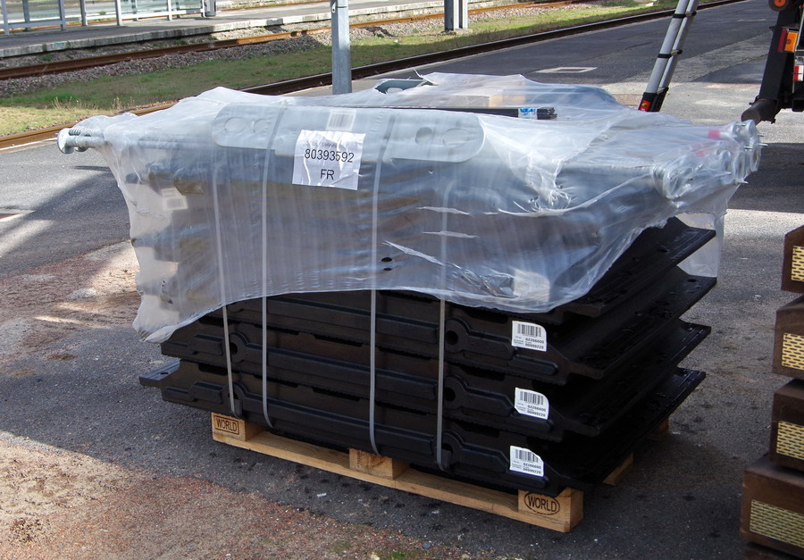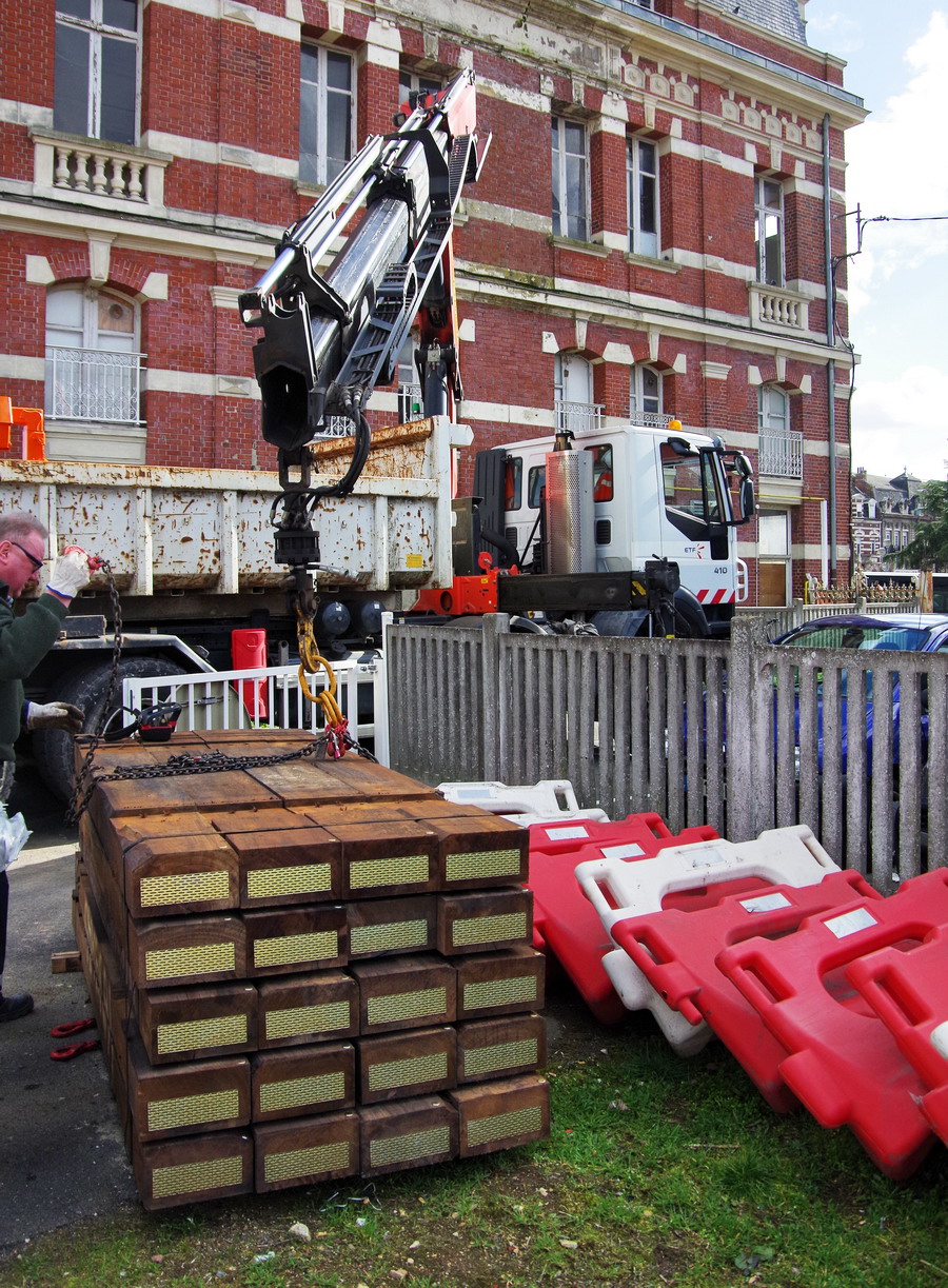 déchargement des traverses en bois pour des travaux sur un PN à Cambrai avec ETF le 11-03-2019