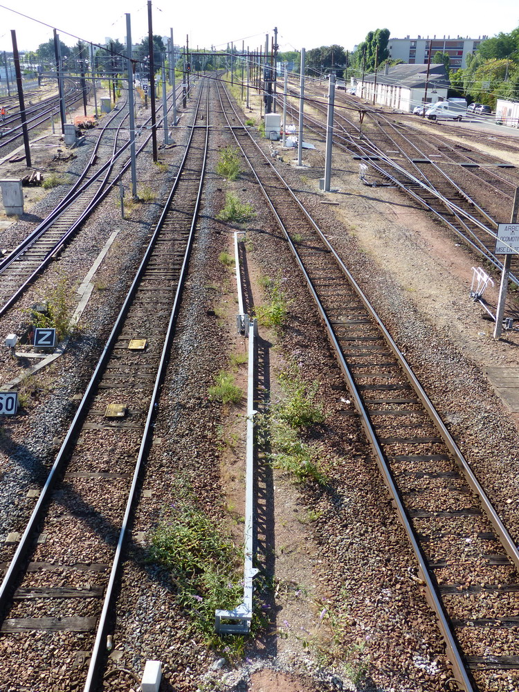 voici l'autre côté de la passerelle avec deux portiques de caténaires entre les voies pour Nantes