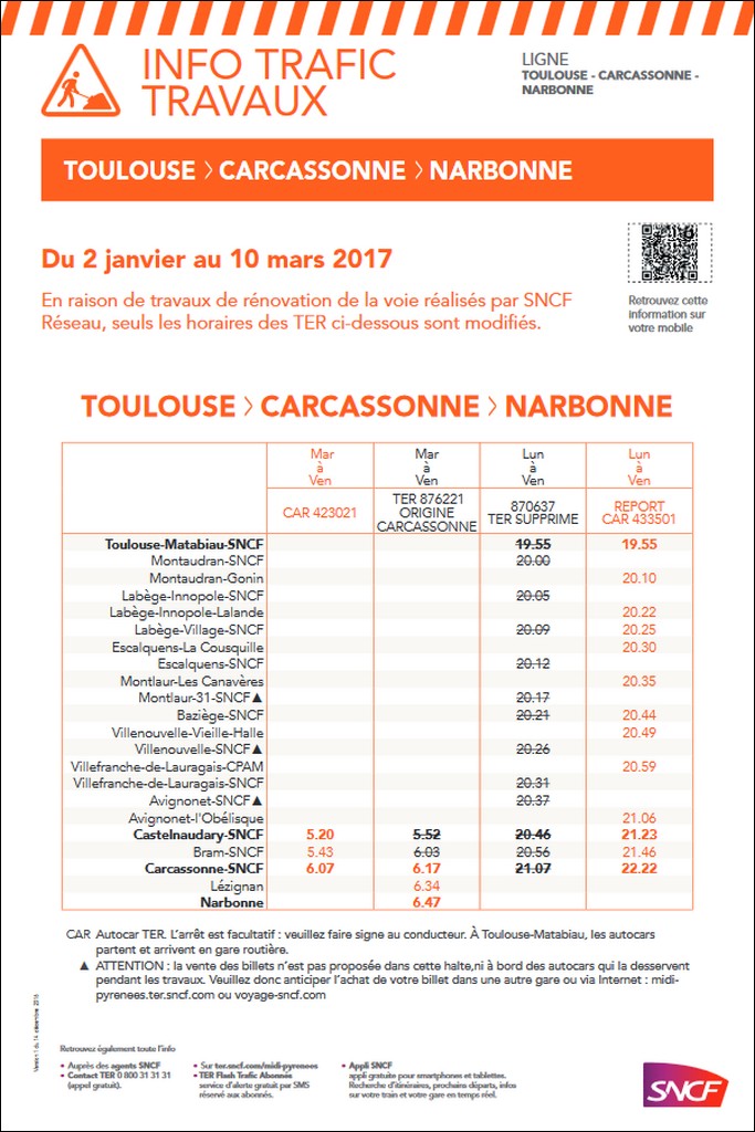 http://www.sncf-reseau.fr/fr/projets-ch ... arcassonneLe 2 janvier 2017, débutent d’importants travaux de modernisation de la ligne Castelnaudary - Carcassonne, située sur un axe majeur de la région Occitanie. Ces travaux consistent à renouveler tous les constituants de la voie ferrée tels que les rails, les traverses et le ballast. Réalisé la nuit, afin d’éviter les conséquences sur les horaires des trains dans la journée, ce chantier, mené en deux phases, permettra de remettre entièrement à neuf les 35 km de voie.